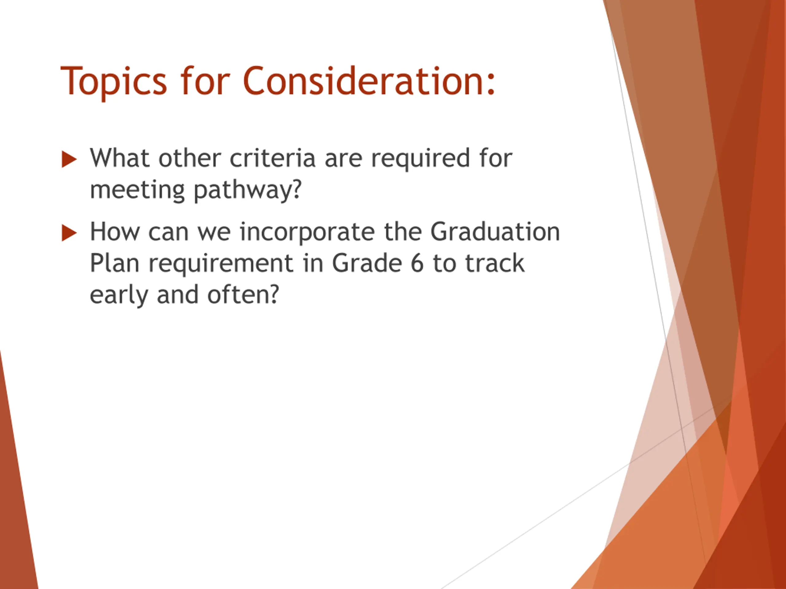 Topics for Consideration: What other criteria are required for meeting pathway? How can we incorporate the Graduation Plan requirement in Grade 6 to track early and often?
