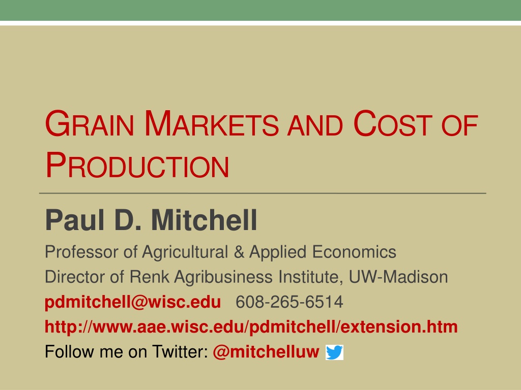 GRAIN MARKETS AND COST OF PRODUCTION Paul D. Mitchell Professor of Agricultural & Applied Economics Director of Renk Agribusiness Institute, UW-Madison pdmitchell@wisc.edu 608-265-6514 http://www.aae.wisc.edu/pdmitchell/extension.htm Follow me on Twitter: @mitchelluw