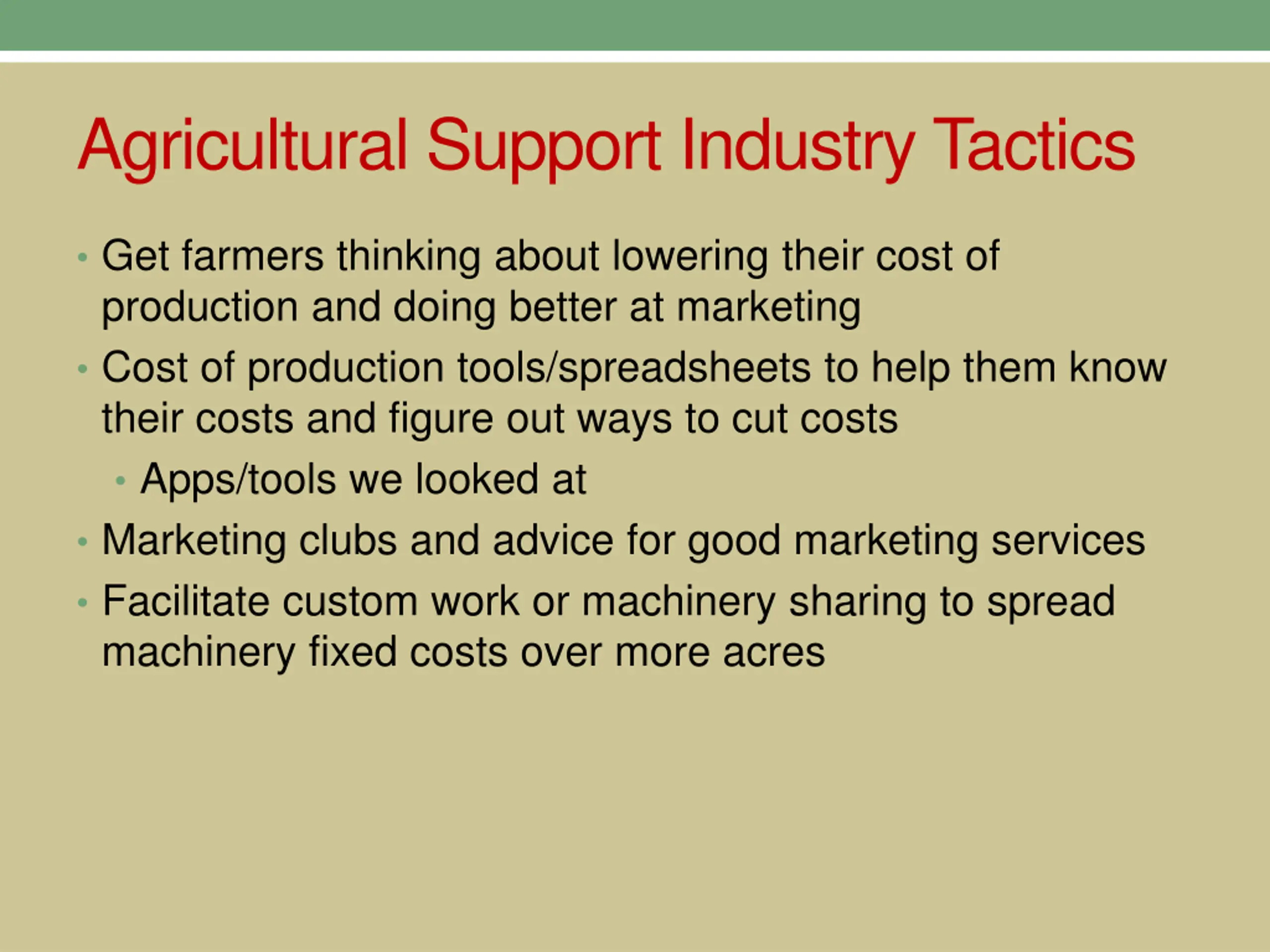 Agricultural Support Industry Tactics Get farmers thinking about lowering their cost of production and doing better at marketing Cost of production tools/spreadsheets to help them know their costs and figure out ways to cut costs Apps/tools we looked at Marketing clubs and advice for good marketing services Facilitate custom work or machinery sharing to spread machinery fixed costs over more acres