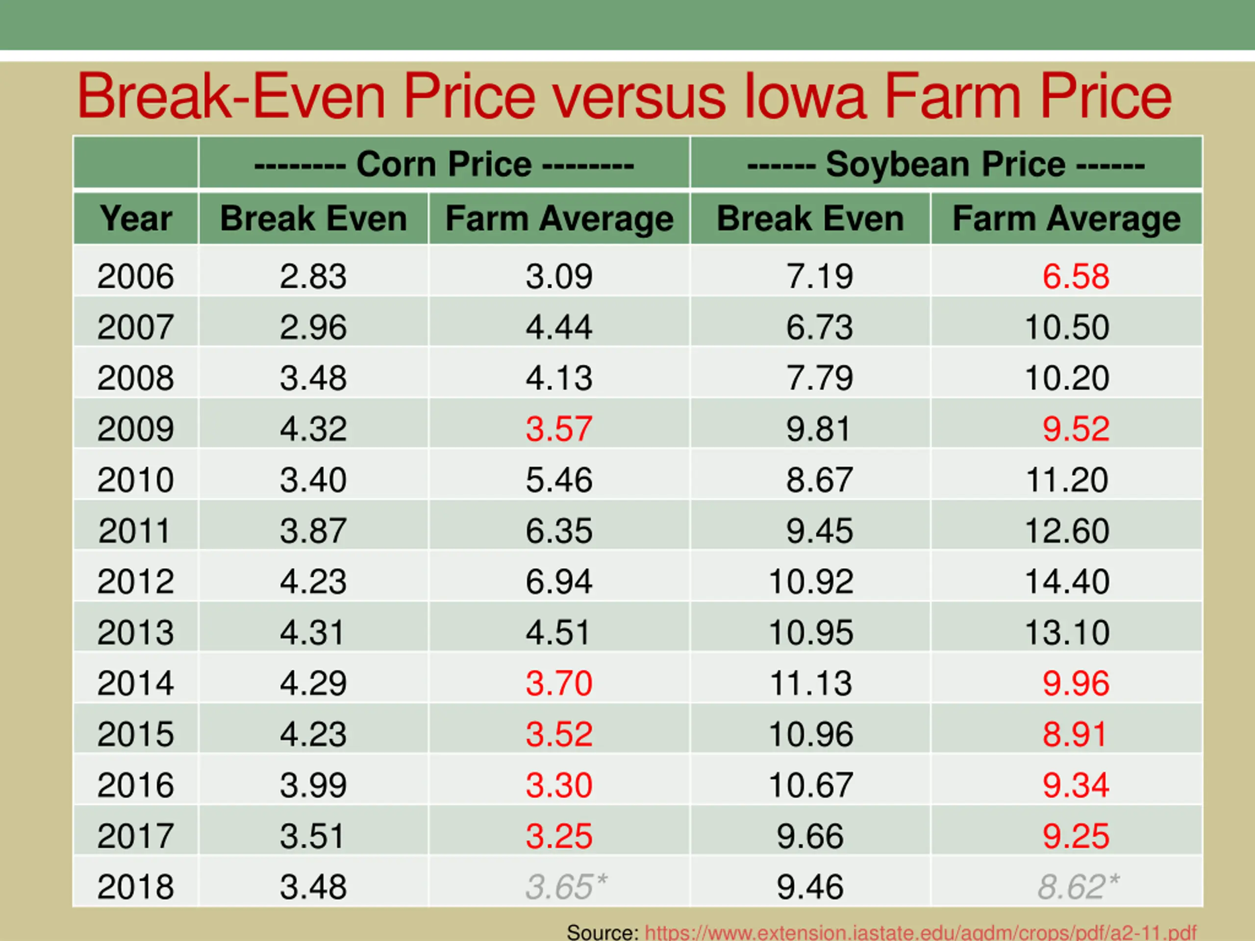 Break-Even Price versus Iowa Farm Price -------- Corn Price -------- Year Break Even Farm Average 2006 2.83 3.09 2007 2.96 4.44 2008 3.48 4.13 2009 4.32 3.57 2010 3.40 5.46 2011 3.87 6.35 2012 4.23 6.94 2013 4.31 4.51 2014 4.29 3.70 2015 4.23 3.52 2016 3.99 3.30 2017 3.51 3.25 2018 3.48 3.65* ------ Soybean Price ------ Break Even 7.19 6.73 7.79 9.81 8.67 9.45 10.92 10.95 11.13 10.96 10.67 9.66 9.46 Farm Average 6.58 10.50 10.20 9.52 11.20 12.60 14.40 13.10 9.96 8.91 9.34 9.25 8.62* Source: https://www.extension.iastate.edu/agdm/crops/pdf/a2-11.pdf