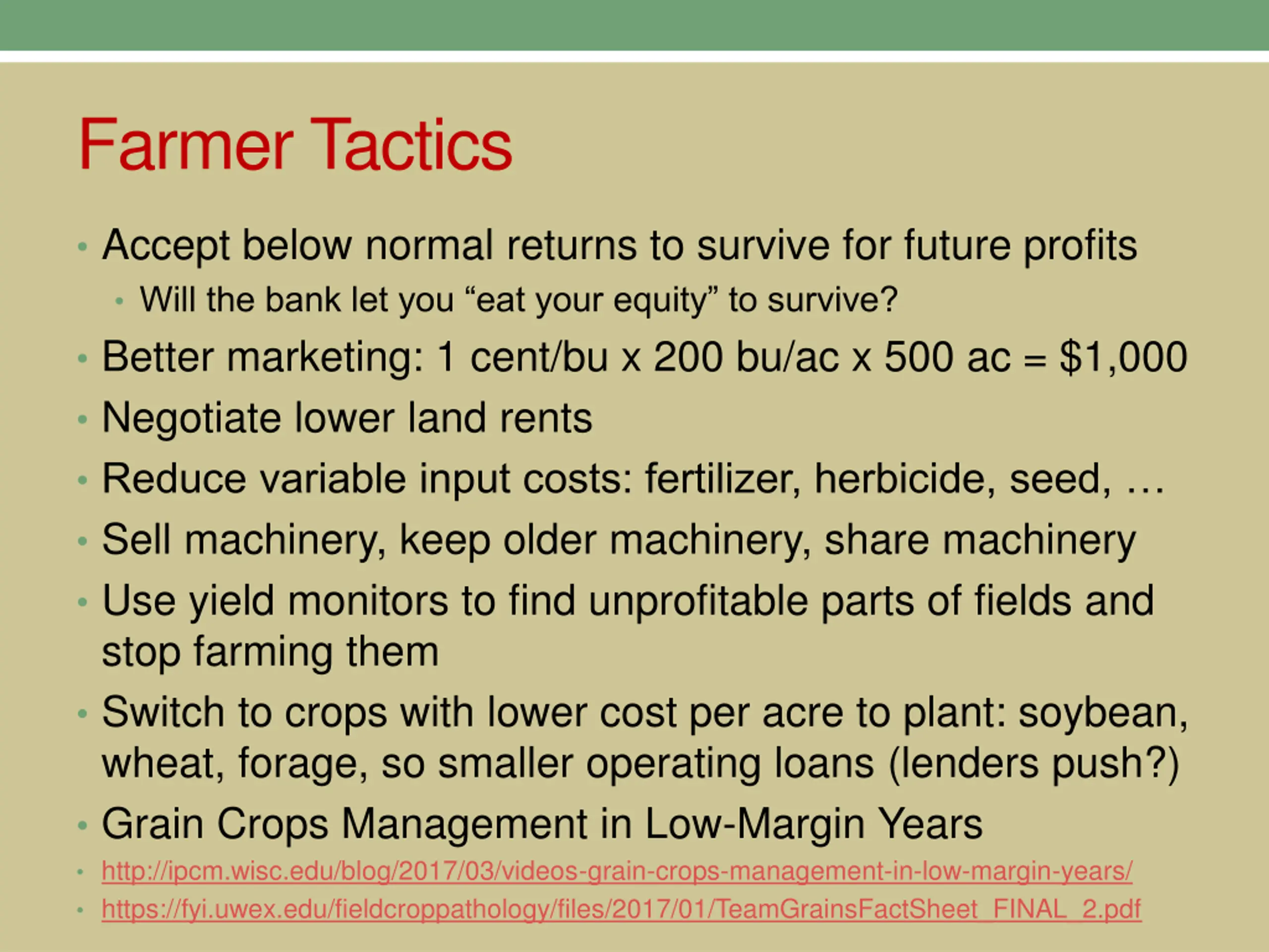 Farmer Tactics Accept below normal returns to survive for future profits Will the bank let you eat your equity to survive? Better marketing: 1 cent/bu x 200 bu/ac x 500 ac = $1,000 Negotiate lower land rents Reduce variable input costs: fertilizer, herbicide, seed, Sell machinery, keep older machinery, share machinery Use yield monitors to find unprofitable parts of fields and stop farming them Switch to crops with lower cost per acre to plant: soybean, wheat, forage, so smaller operating loans (lenders push?) Grain Crops Management in Low-Margin Years http://ipcm.wisc.edu/blog/2017/03/videos-grain-crops-management-in-low-margin-years/ https://fyi.uwex.edu/fieldcroppathology/files/2017/01/TeamGrainsFactSheet_FINAL_2.pdf