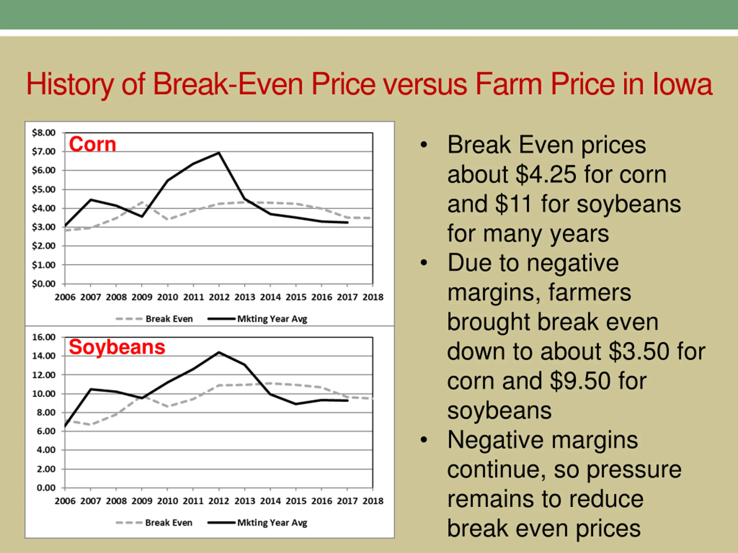 History of Break-Even Price versus Farm Price in Iowa Break Even prices about $4.25 for corn and $11 for soybeans for many years Due to negative margins, farmers brought break even down to about $3.50 for corn and $9.50 for soybeans Negative margins continue, so pressure remains to reduce break even prices Corn Soybeans