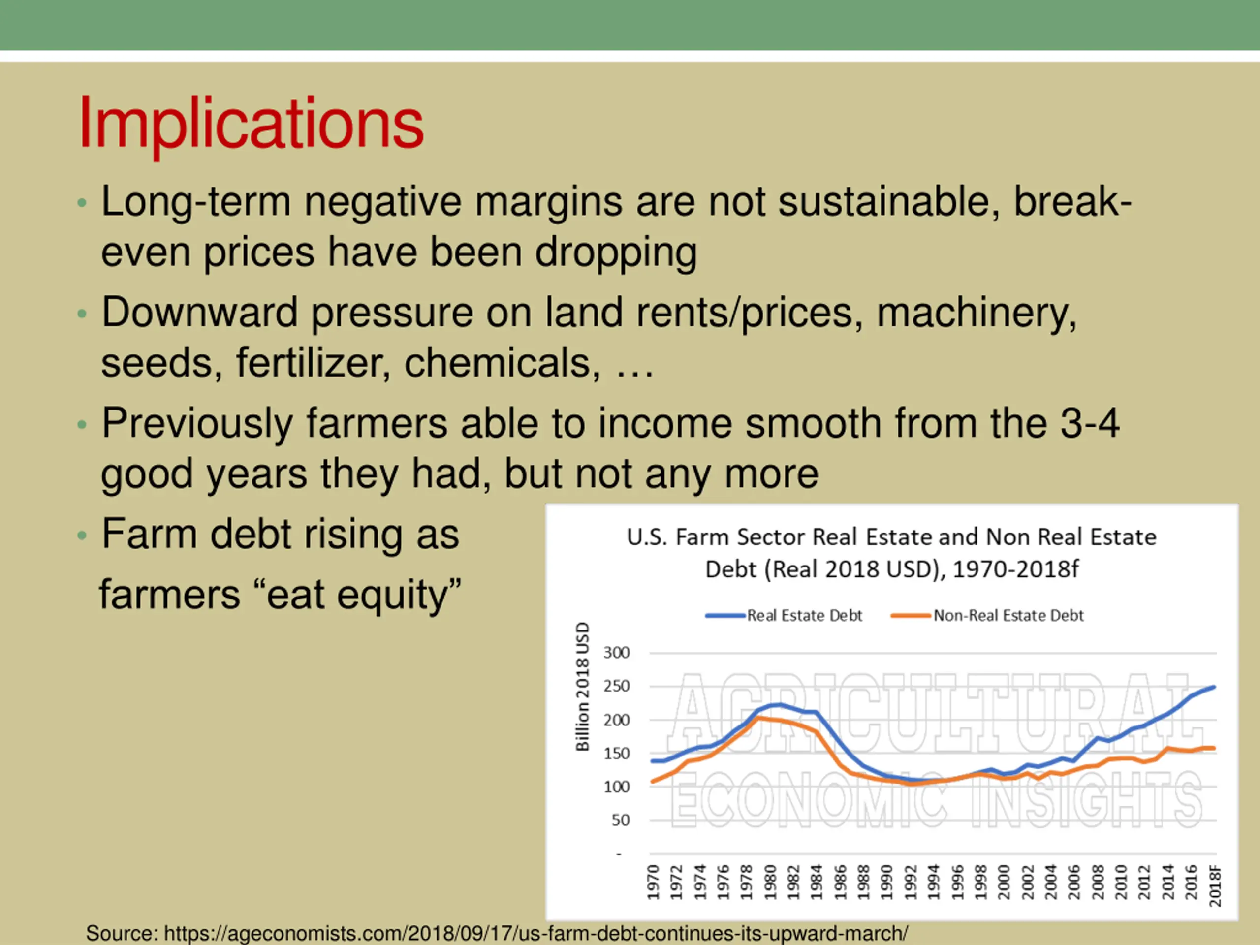 Implications Long-term negative margins are not sustainable, break- even prices have been dropping Downward pressure on land rents/prices, machinery, seeds, fertilizer, chemicals, Previously farmers able to income smooth from the 3-4 good years they had, but not any more Farm debt rising as farmers eat equity Source: https://ageconomists.com/2018/09/17/us-farm-debt-continues-its-upward-march/
