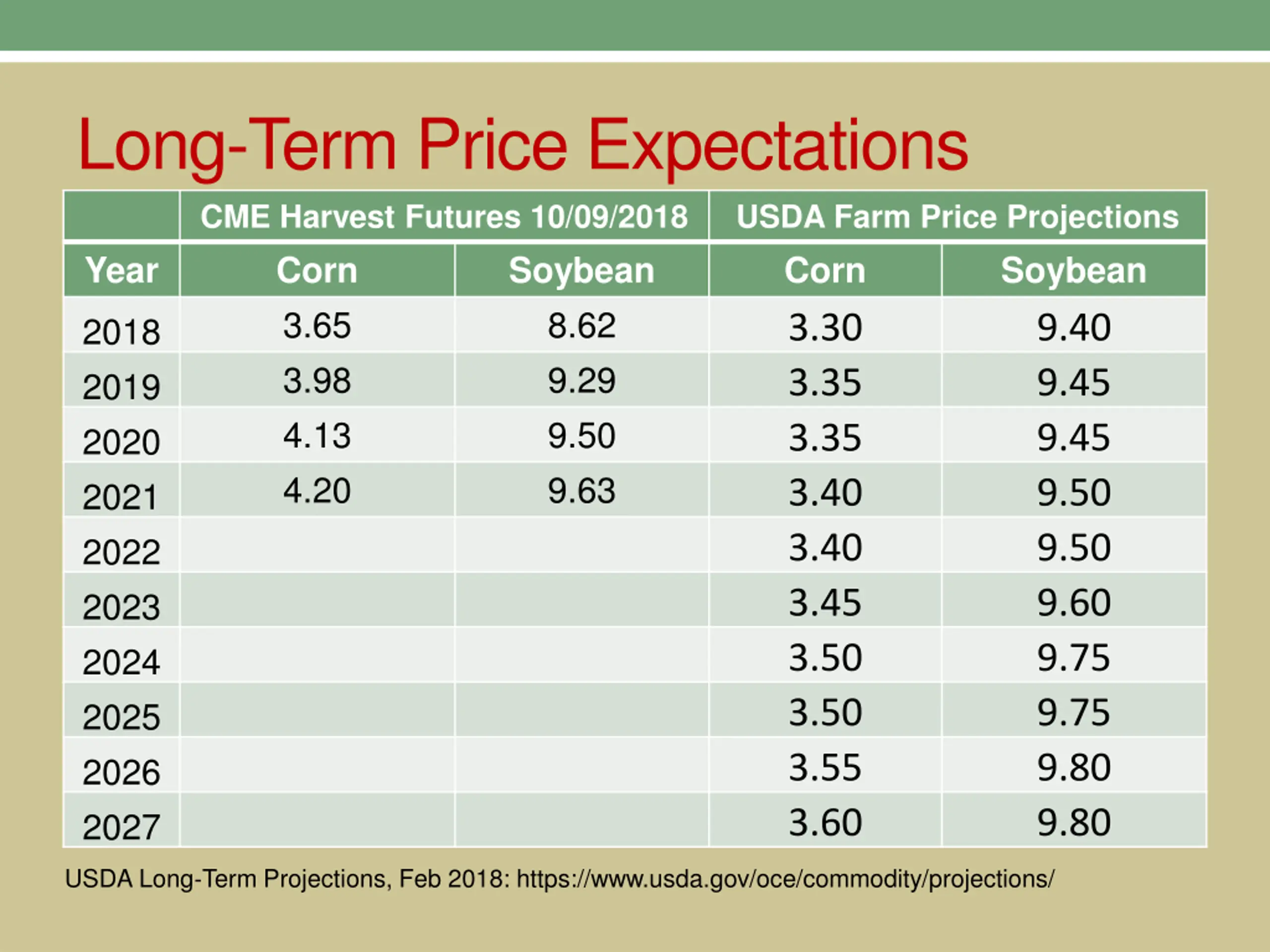 Long-Term Price Expectations CME Harvest Futures 10/09/2018 Year Corn Soybean 3.65 3.98 4.13 4.20 USDA Farm Price Projections Corn 3.30 3.35 3.35 3.40 3.40 3.45 3.50 3.50 3.55 3.60 Soybean 9.40 9.45 9.45 9.50 9.50 9.60 9.75 9.75 9.80 9.80 8.62 9.29 9.50 9.63 2018 2019 2020 2021 2022 2023 2024 2025 2026 2027 USDA Long Term Projections, Feb 2018: https://www.usda.gov/oce/commodity/projections/