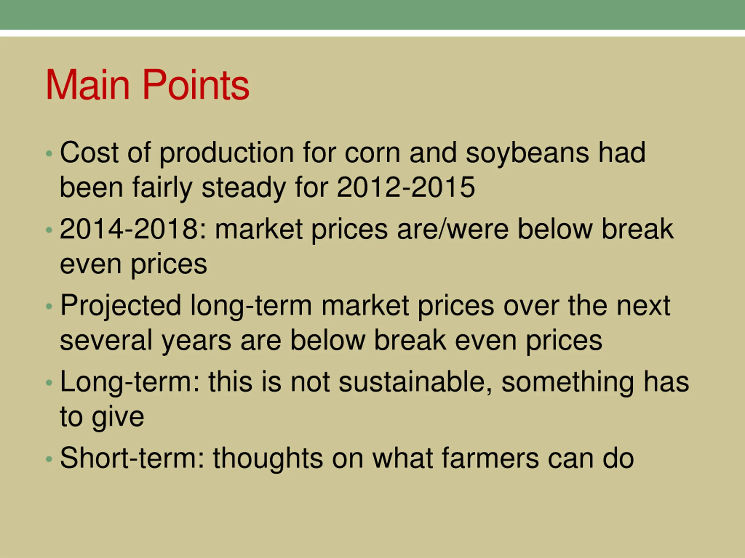 Main Points Cost of production for corn and soybeans had been fairly steady for 2012-2015 2014-2018: market prices are/were below break even prices Projected long-term market prices over the next several years are below break even prices Long-term: this is not sustainable, something has to give Short-term: thoughts on what farmers can do