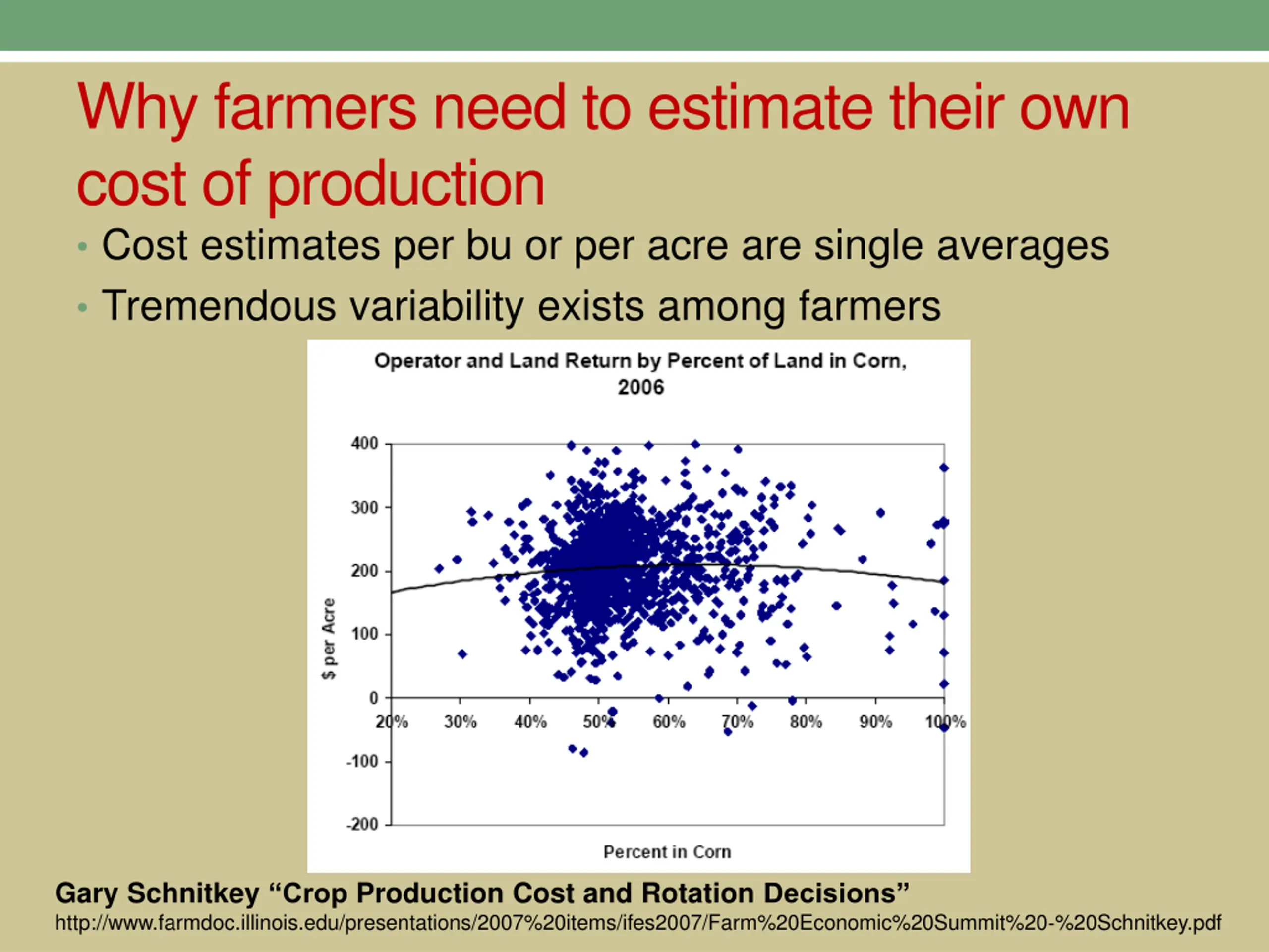 Why farmers need to estimate their own cost of production Cost estimates per bu or per acre are single averages Tremendous variability exists among farmers Gary Schnitkey Crop Production Cost and Rotation Decisions http://www.farmdoc.illinois.edu/presentations/2007%20items/ifes2007/Farm%20Economic%20Summit%20 %20Schnitkey.pdf
