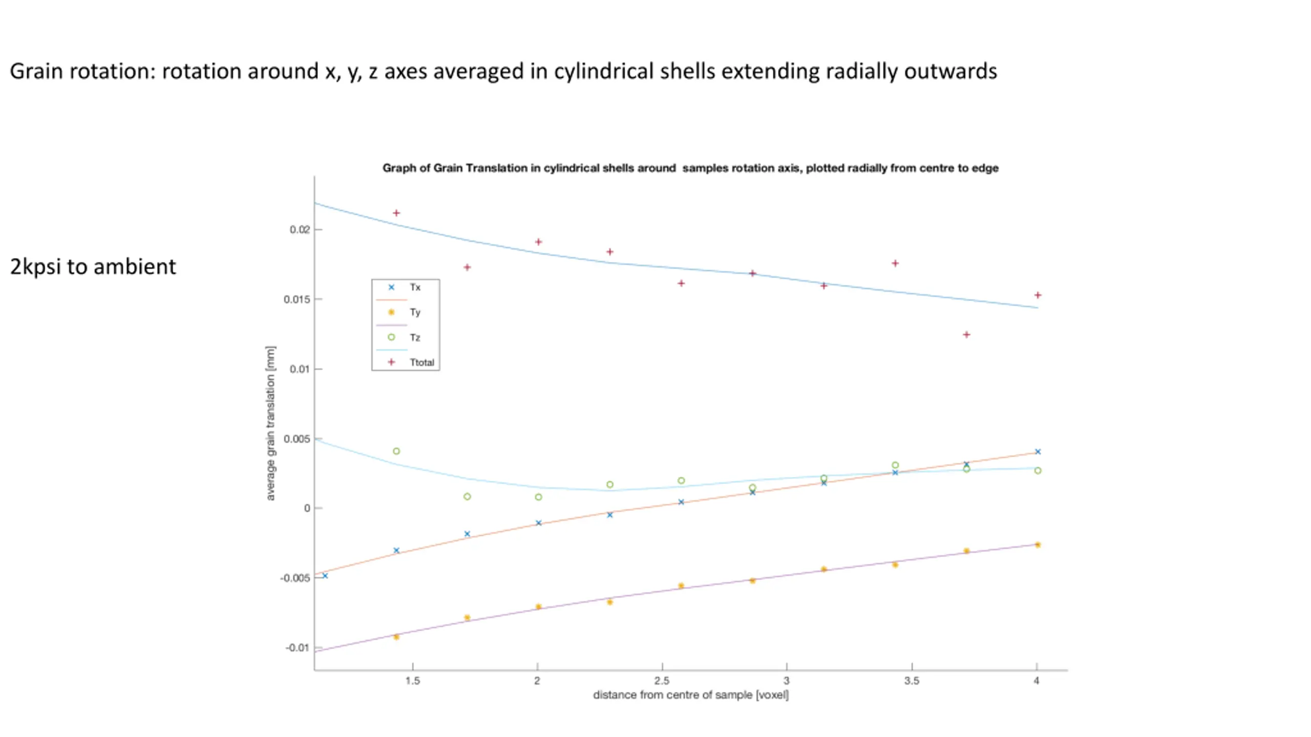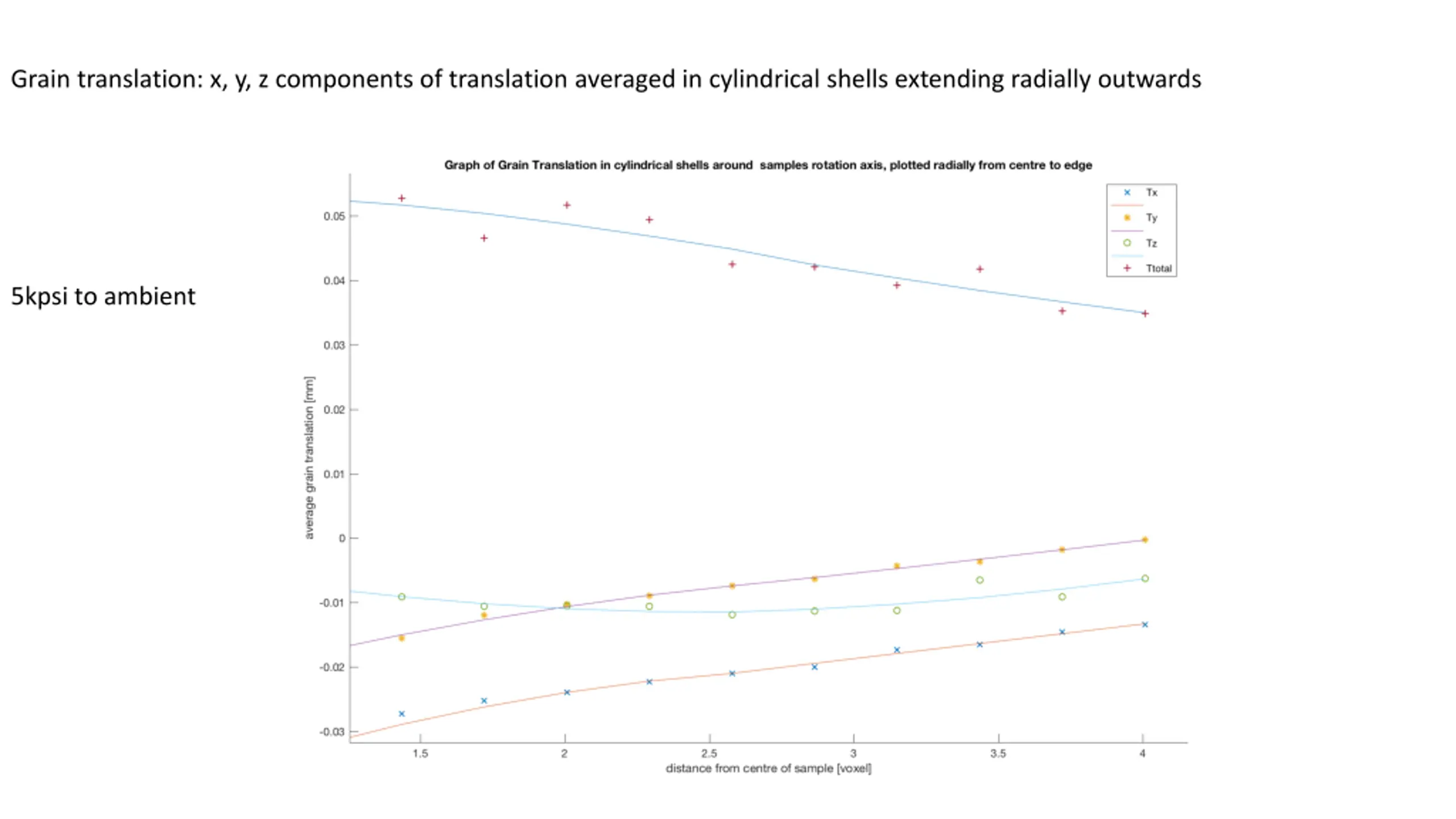 Grain translation: x, y, z components of translation averaged in cylindrical shells extending radially outwards 2kpsi to ambient