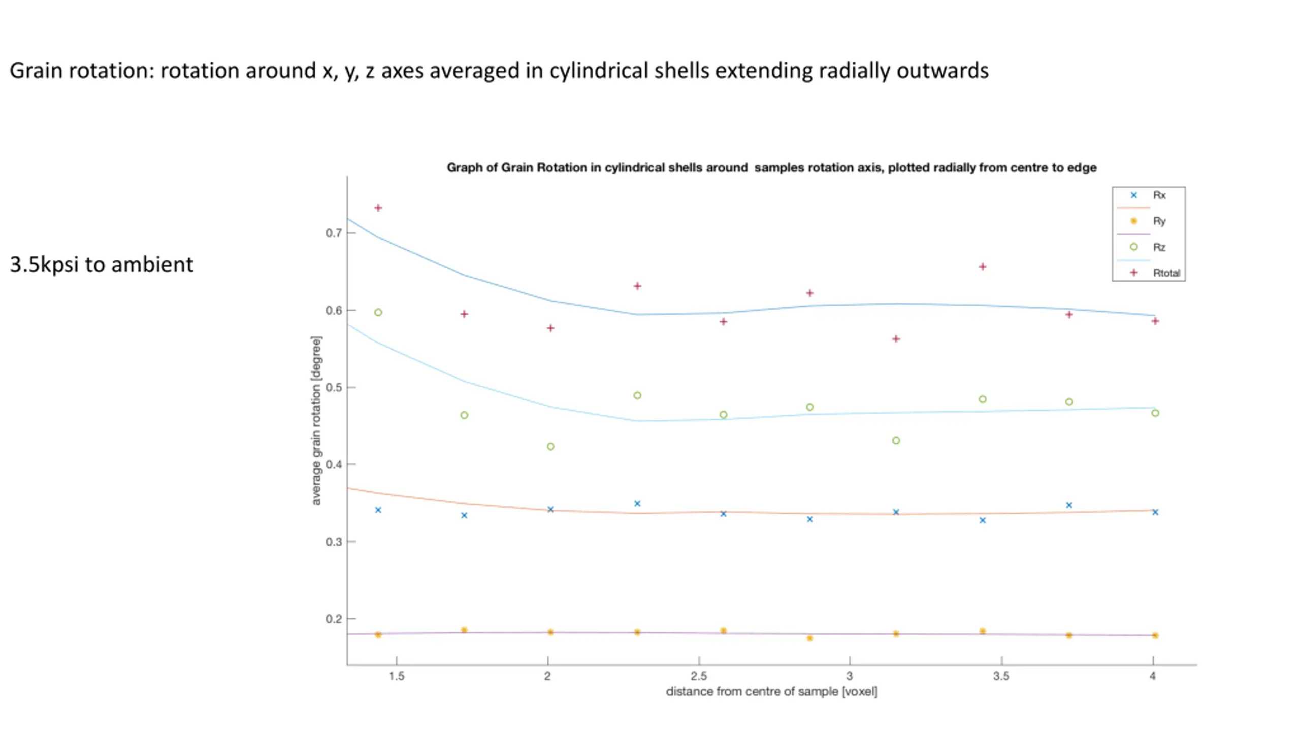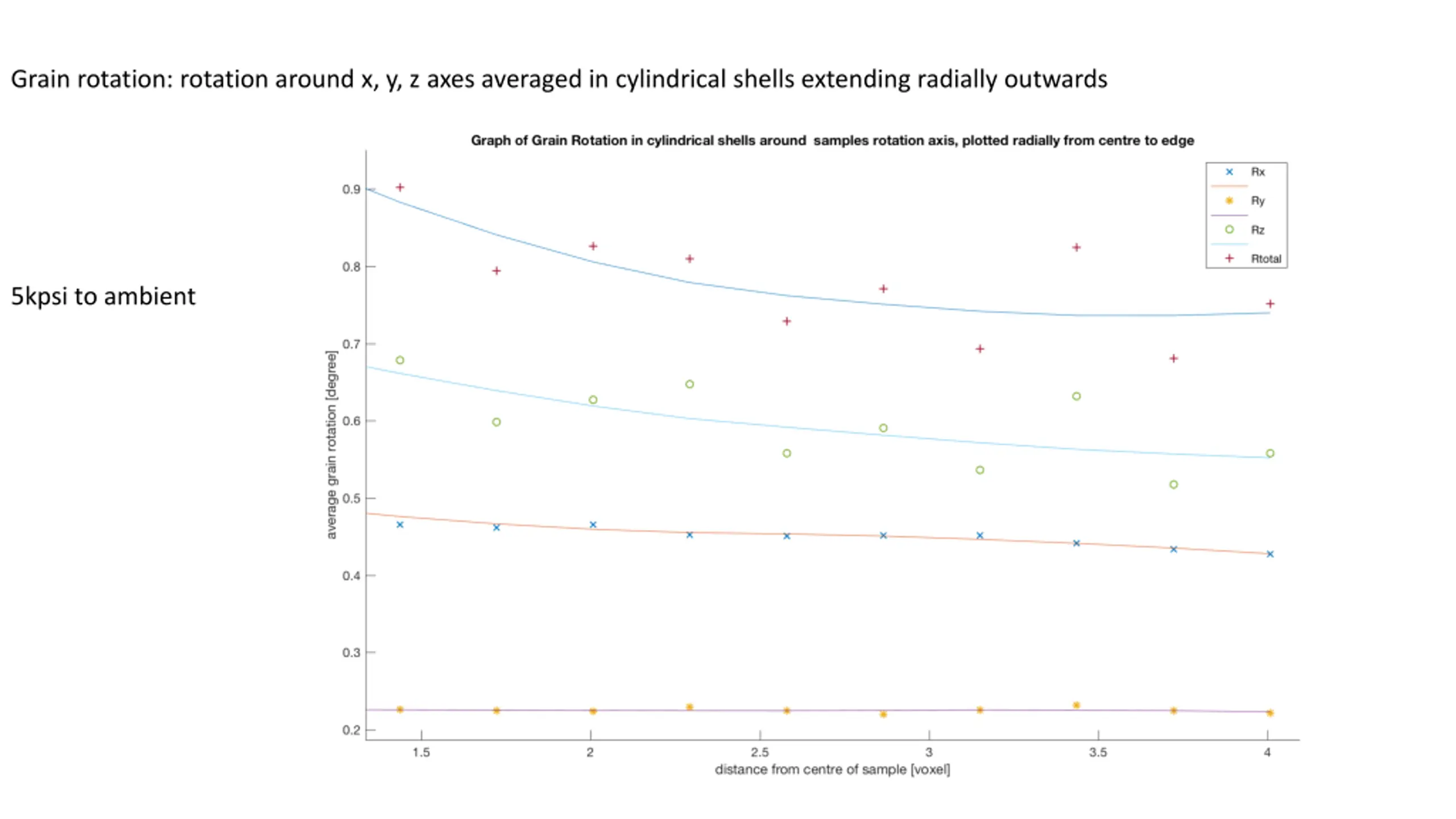 Grain rotation: rotation around x, y, z axes averaged in cylindrical shells extending radially outwards 5kpsi to ambient