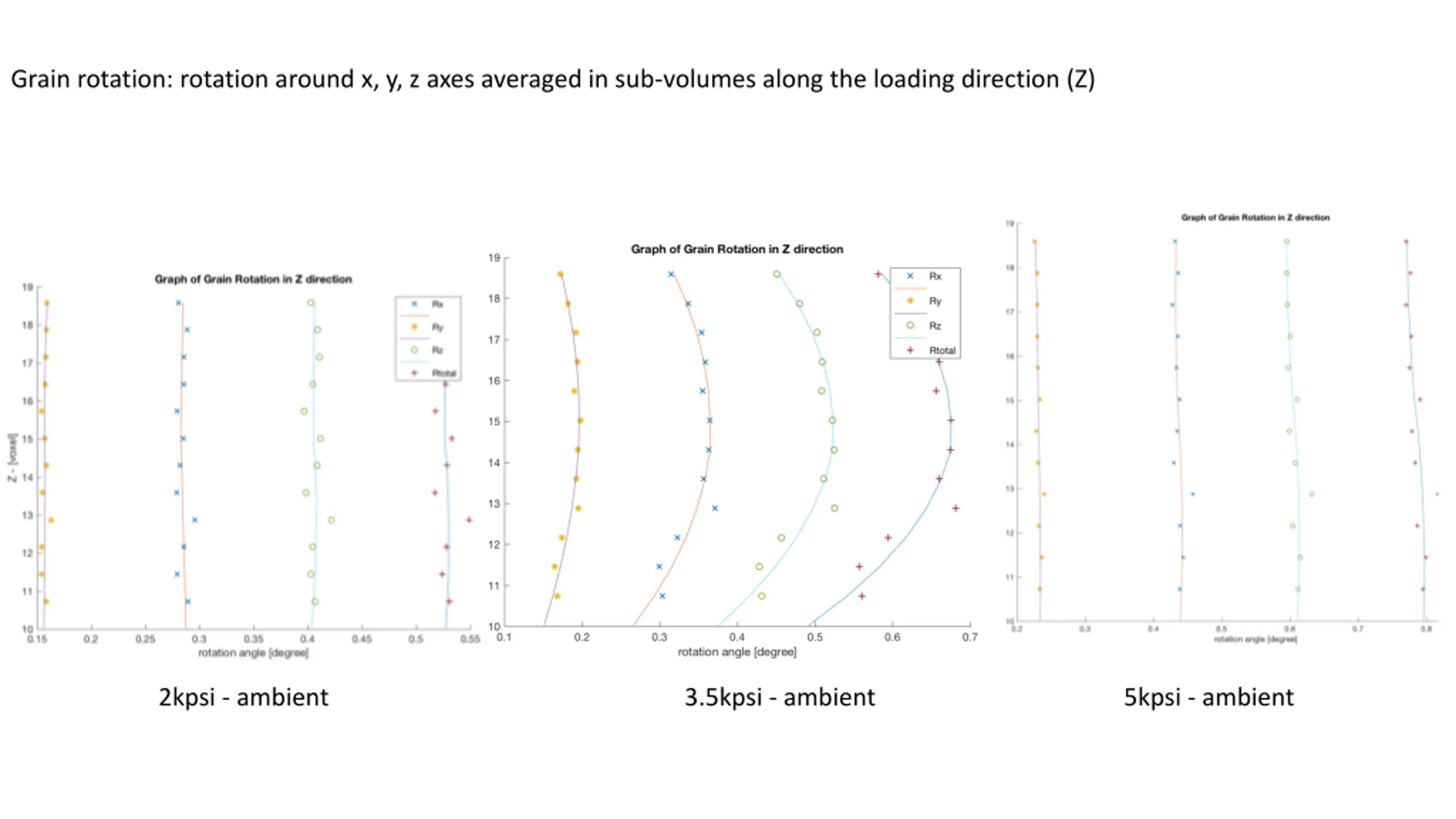 Grain rotation: rotation around x, y, z axes averaged in sub-volumes along the loading direction (Z) 2kpsi - ambient 3.5kpsi - ambient 5kpsi - ambient
