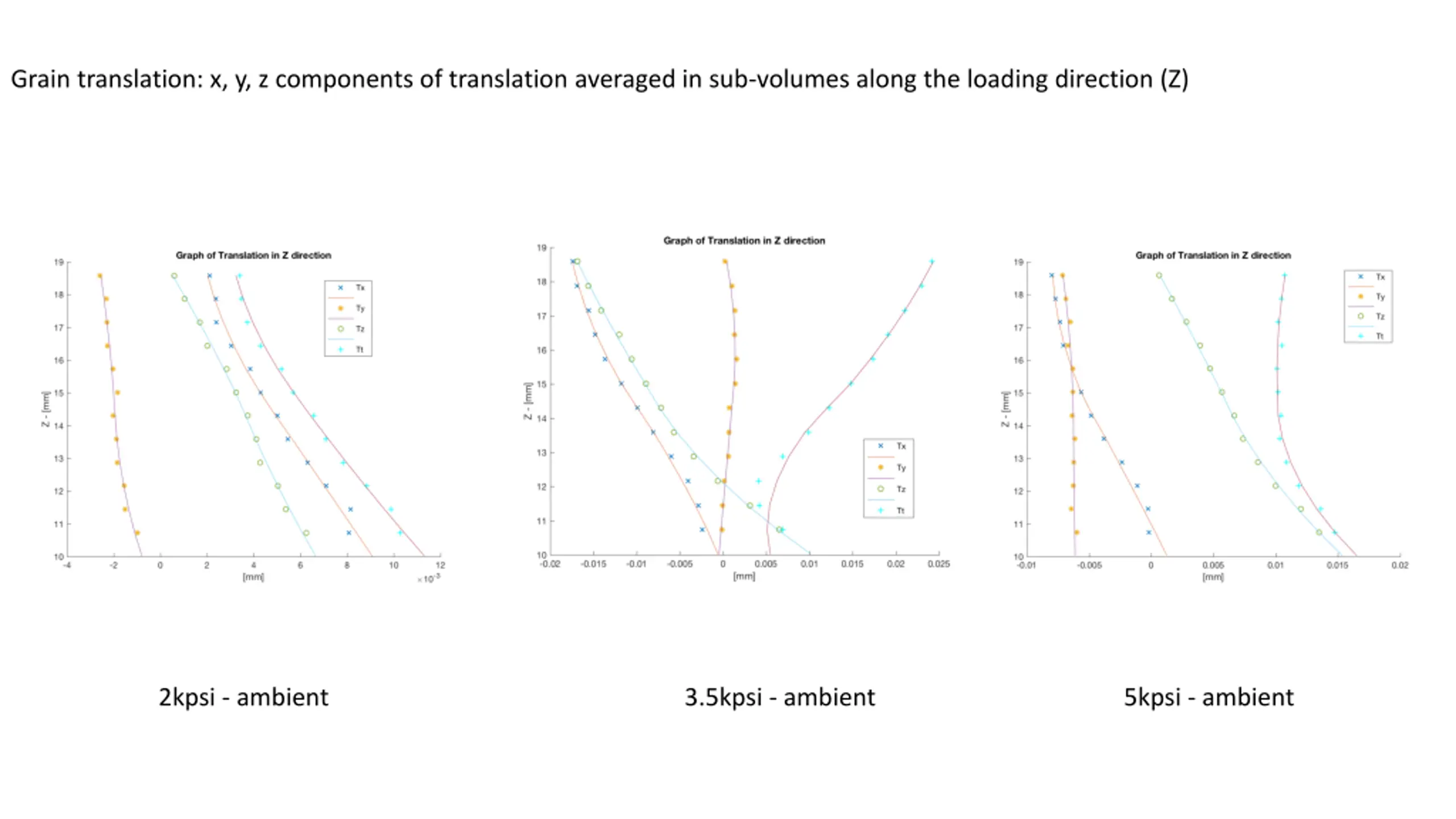 Grain translation: x, y, z components of translation averaged in sub-volumes along the loading direction (Z) 2kpsi - ambient 3.5kpsi - ambient 5kpsi - ambient