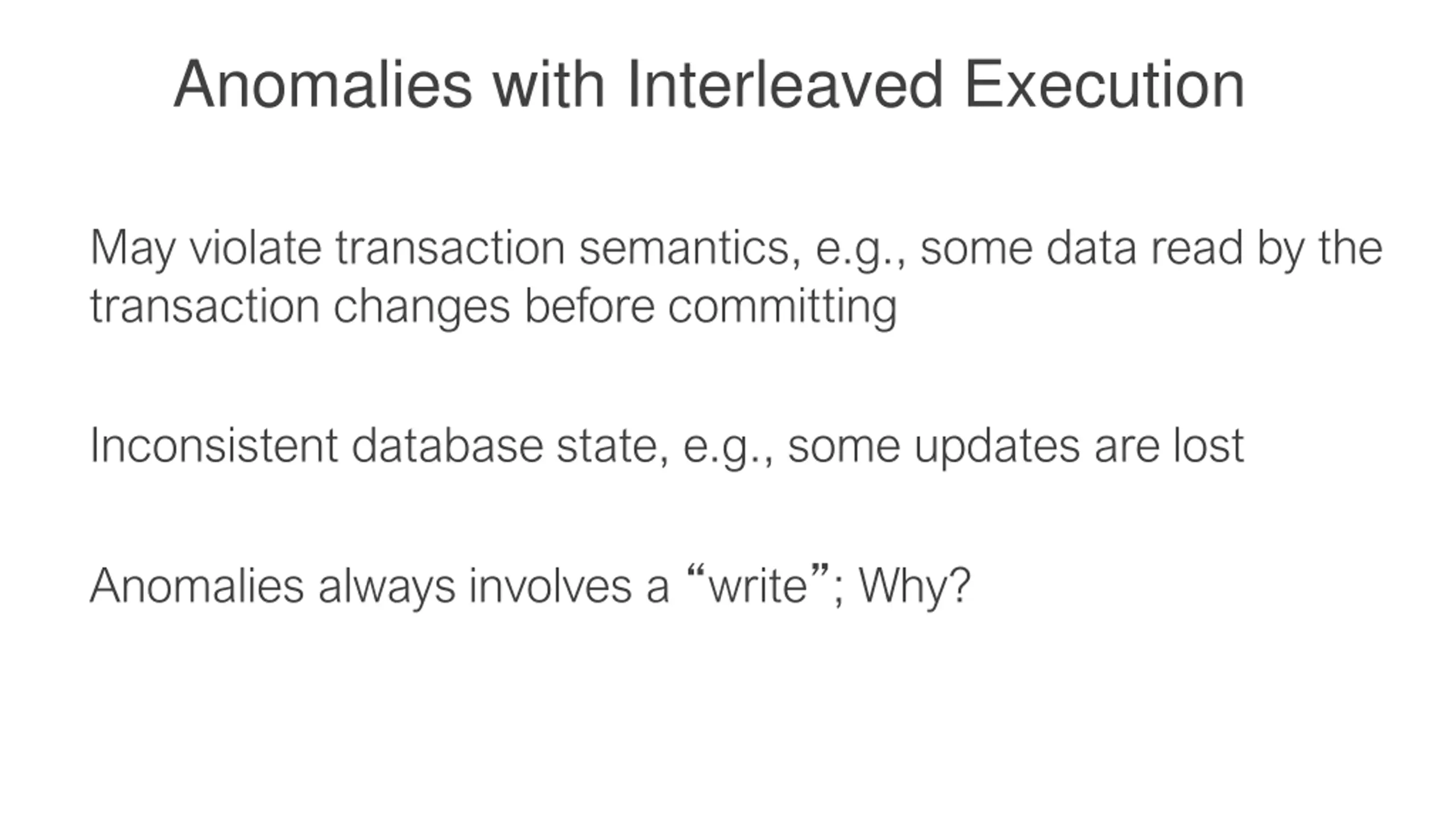 Anomalies with Interleaved Execution May violate transaction semantics, e.g., some data read by the transaction changes before committing Inconsistent database state, e.g., some updates are lost Anomalies always involves a write ; Why?