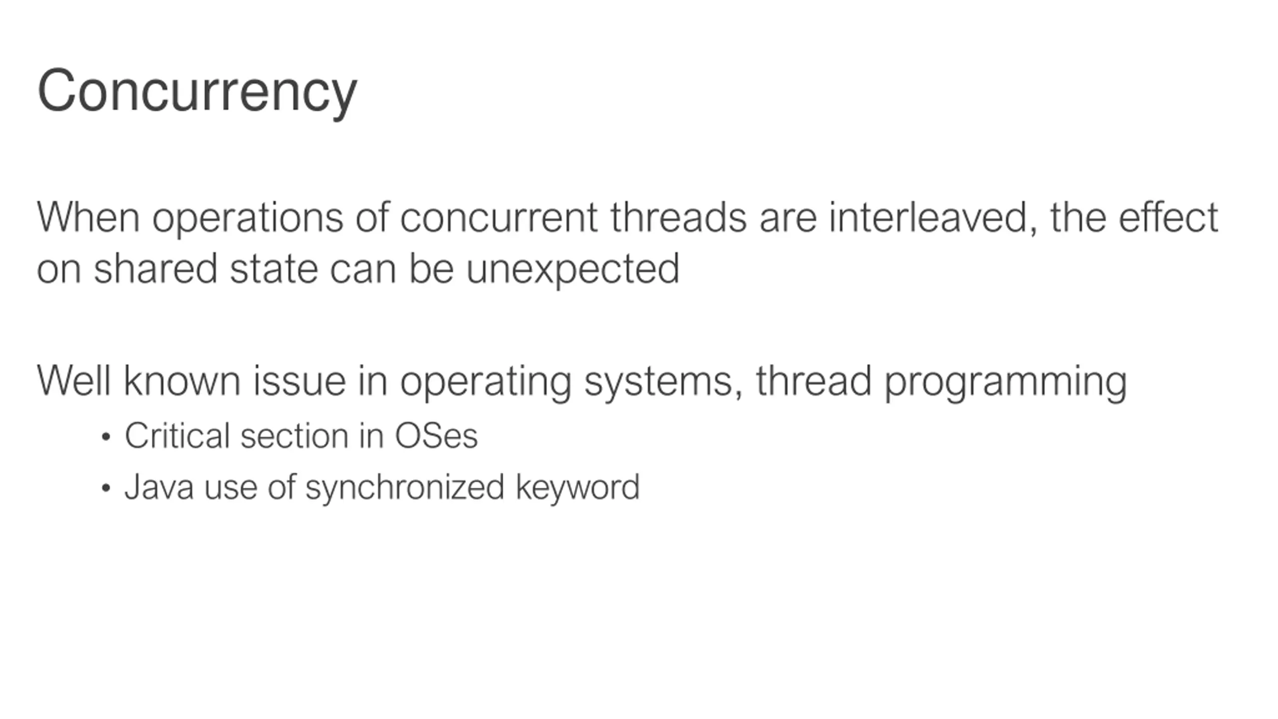 Concurrency When operations of concurrent threads are interleaved, the effect on shared state can be unexpected Well known issue in operating systems, thread programming Critical section in OSes Java use of synchronized keyword
