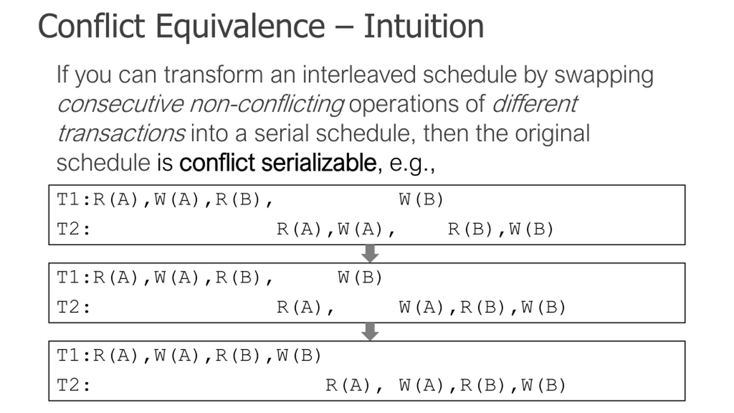 Conflict Equivalence Intuition If you can transform an interleaved schedule by swapping consecutive non-conflicting operations of different transactions into a serial schedule, then the original schedule is conflict conflict serializable serializable, e.g., T1:R(A),W(A), R(B),W(B) T2: R(A),W(A), R(B),W(B) T1:R(A),W(A), R(B), W(B) T2: R(A), W(A), R(B),W(B) T1:R(A),W(A),R(B), W(B) T2: R(A),W(A), R(B),W(B)