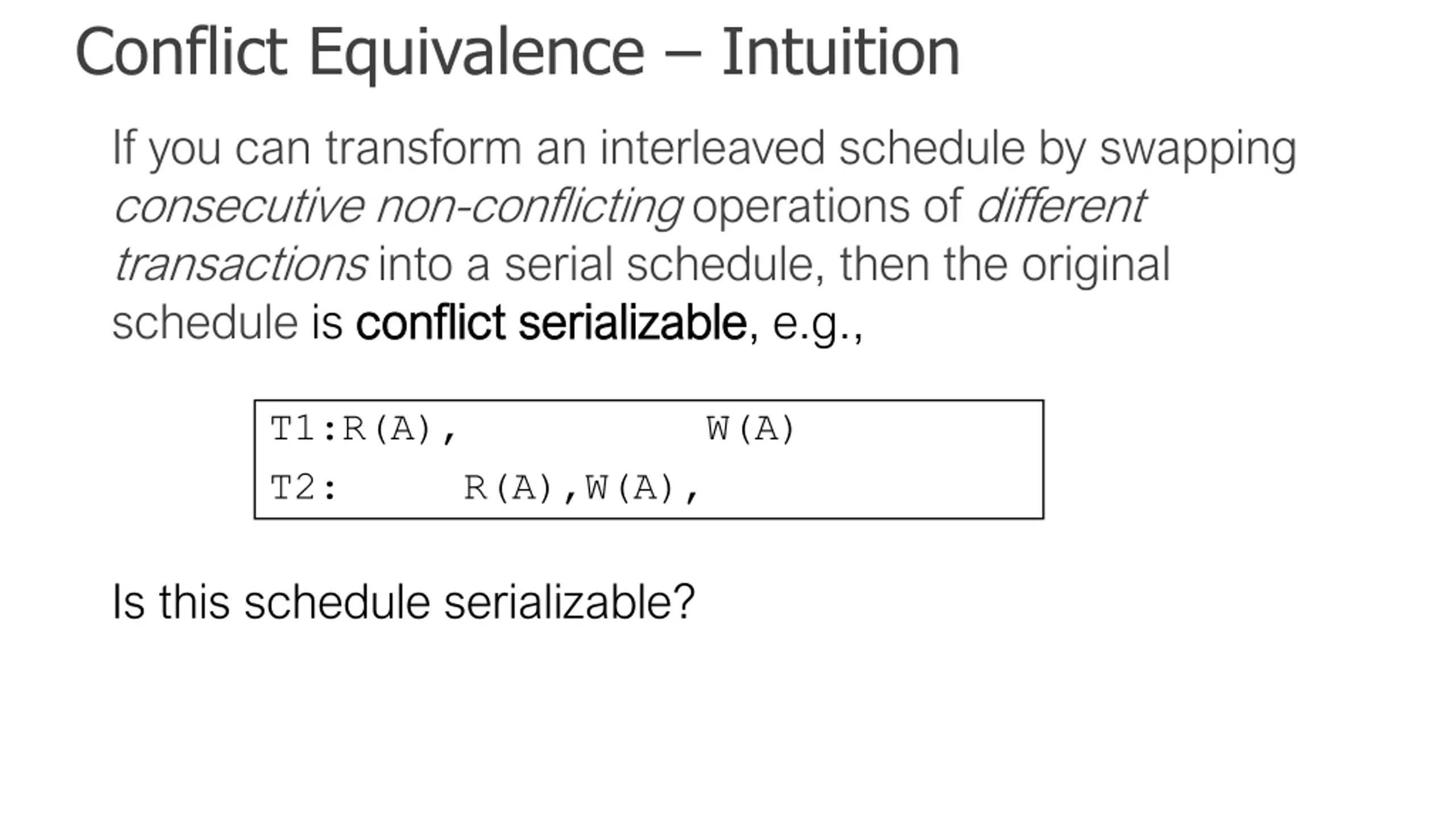 Conflict Equivalence Intuition If you can transform an interleaved schedule by swapping consecutive non-conflicting operations of different transactions into a serial schedule, then the original schedule is conflict conflict serializable serializable, e.g., T1:R(A), W(A) T2: R(A),W(A), Is this schedule serializable?