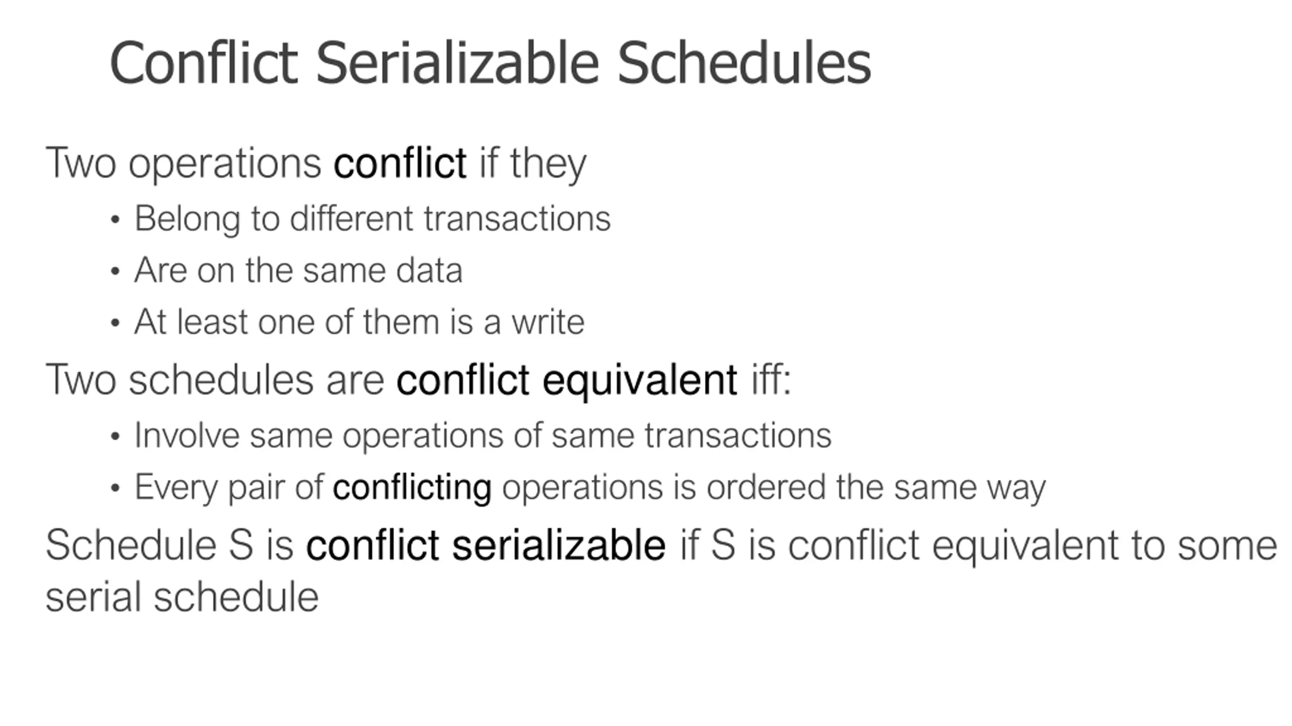 Conflict Serializable Schedules Two operations conflict if they Belong to different transactions Are on the same data At least one of them is a write Two schedules are conflict equivalent iff: Involve same operations of same transactions Every pair of conflicting operations is ordered the same way Schedule S is conflict serializable if S is conflict equivalent to some serial schedule