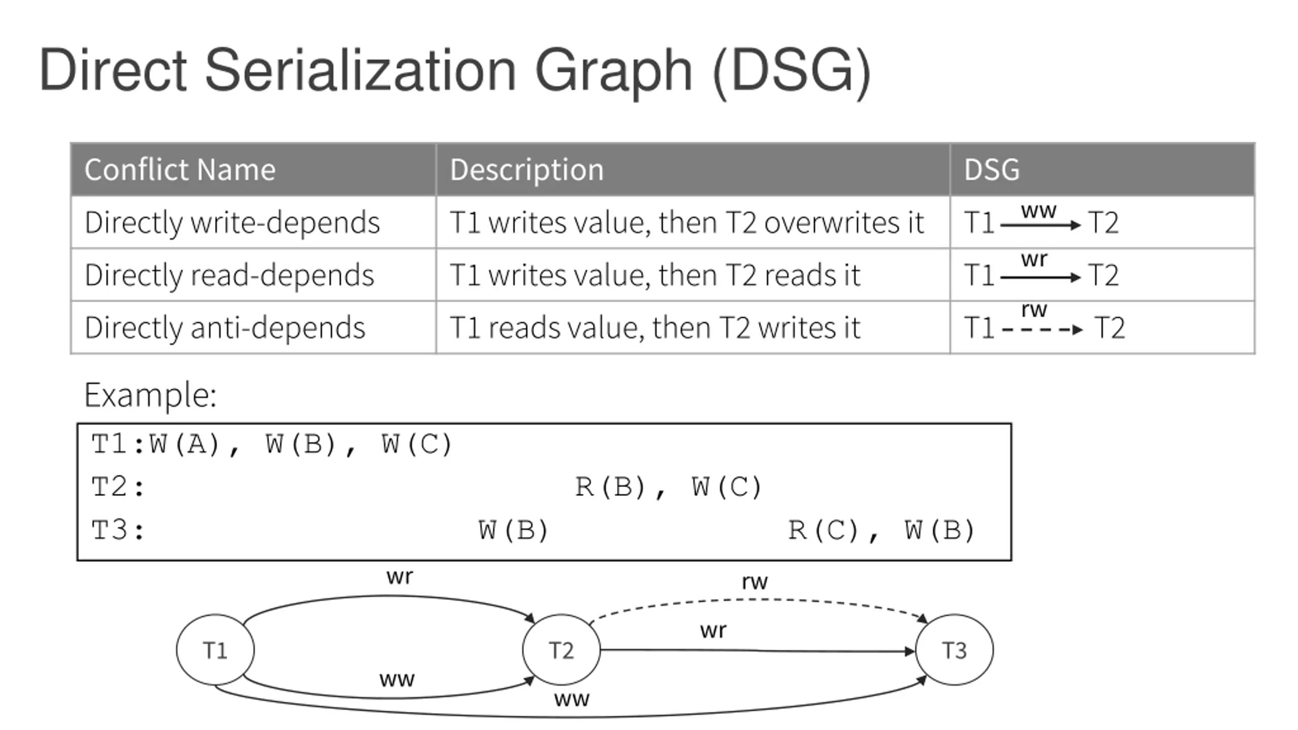 Direct Serialization Graph (DSG) Conflict Name Directly write-depends Directly read-depends Directly anti-depends Description T1 writes value, then T2 overwrites it T1 writes value, then T2 reads it T1 reads value, then T2 writes it DSG T1 T2 T1 T2 T1 T2 ww wr rw Example: T1:W(A), W(B), W(C) T2: T3: W(B) R(B), W(C) R(C), W(B) wr rw wr T1 T2 T3 ww ww