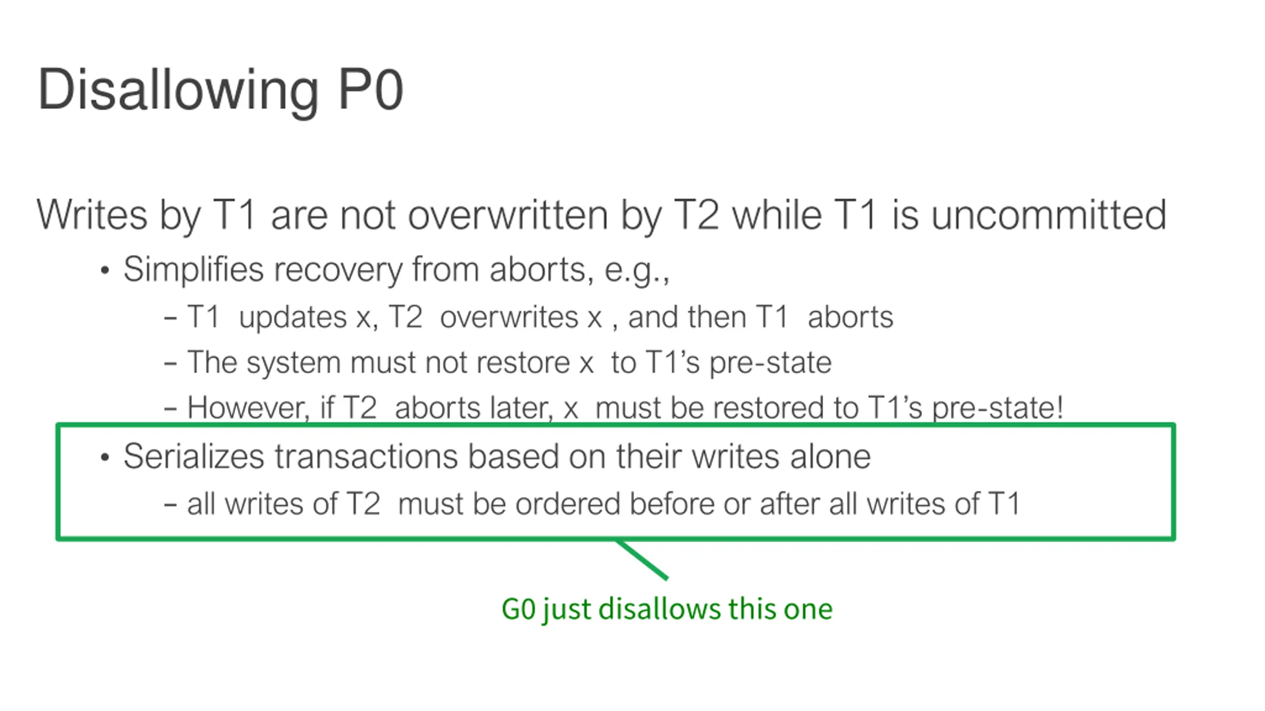 Disallowing P0 Writes by T1 are not overwritten by T2 while T1 is uncommitted Simplifies recovery from aborts, e.g., T1 updates x, T2 overwrites x , and then T1 aborts The system must not restore x to T1 s pre-state However, if T2 aborts later, x must be restored to T1 s pre-state! Serializes transactions based on their writes alone all writes of T2 must be ordered before or after all writes of T1 G0 just disallows this one