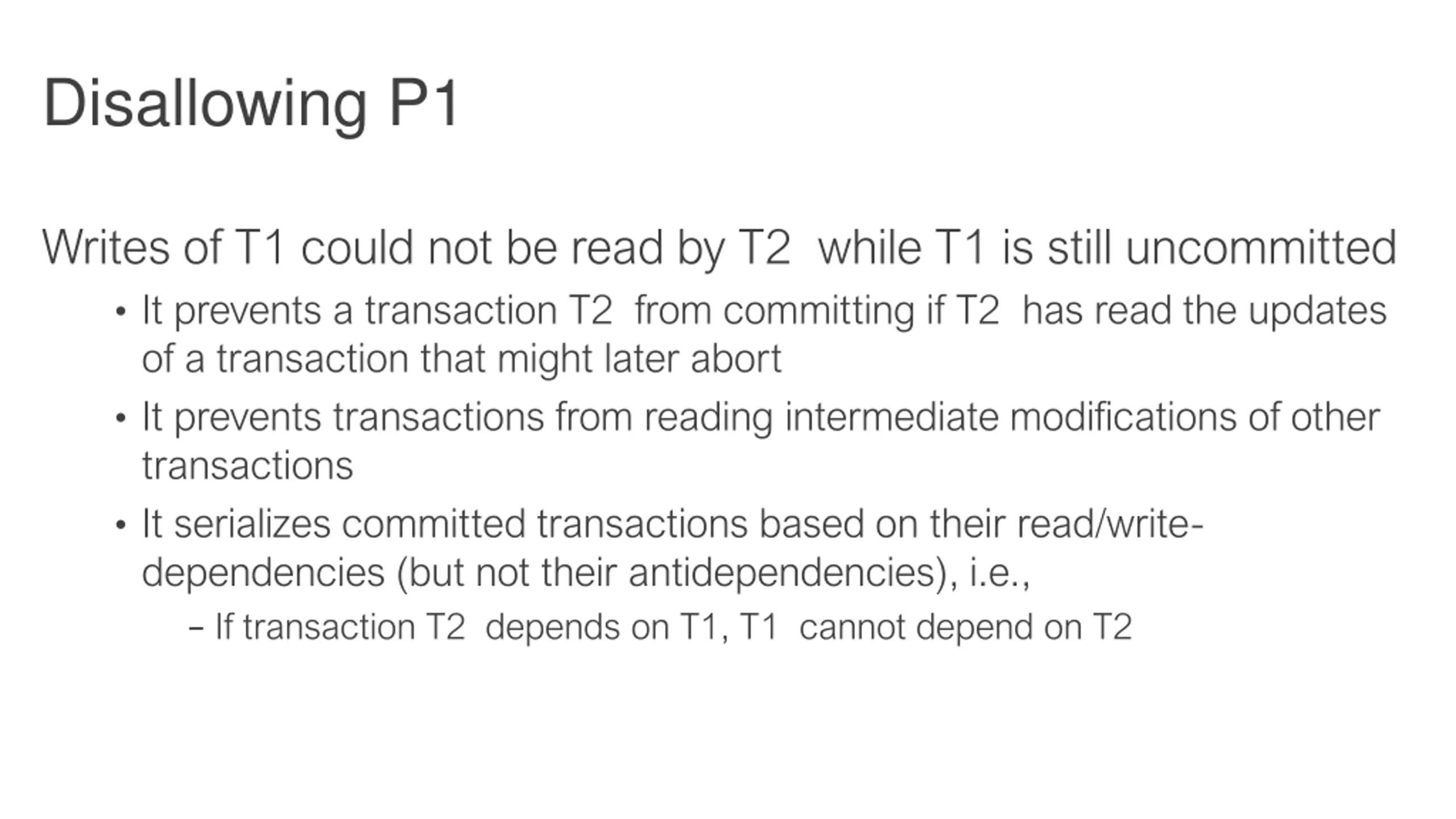 Disallowing P1 Writes of T1 could not be read by T2 while T1 is still uncommitted It prevents a transaction T2 from committing if T2 has read the updates of a transaction that might later abort It prevents transactions from reading intermediate modifications of other transactions It serializes committed transactions based on their read/write- dependencies (but not their antidependencies), i.e., If transaction T2 depends on T1, T1 cannot depend on T2