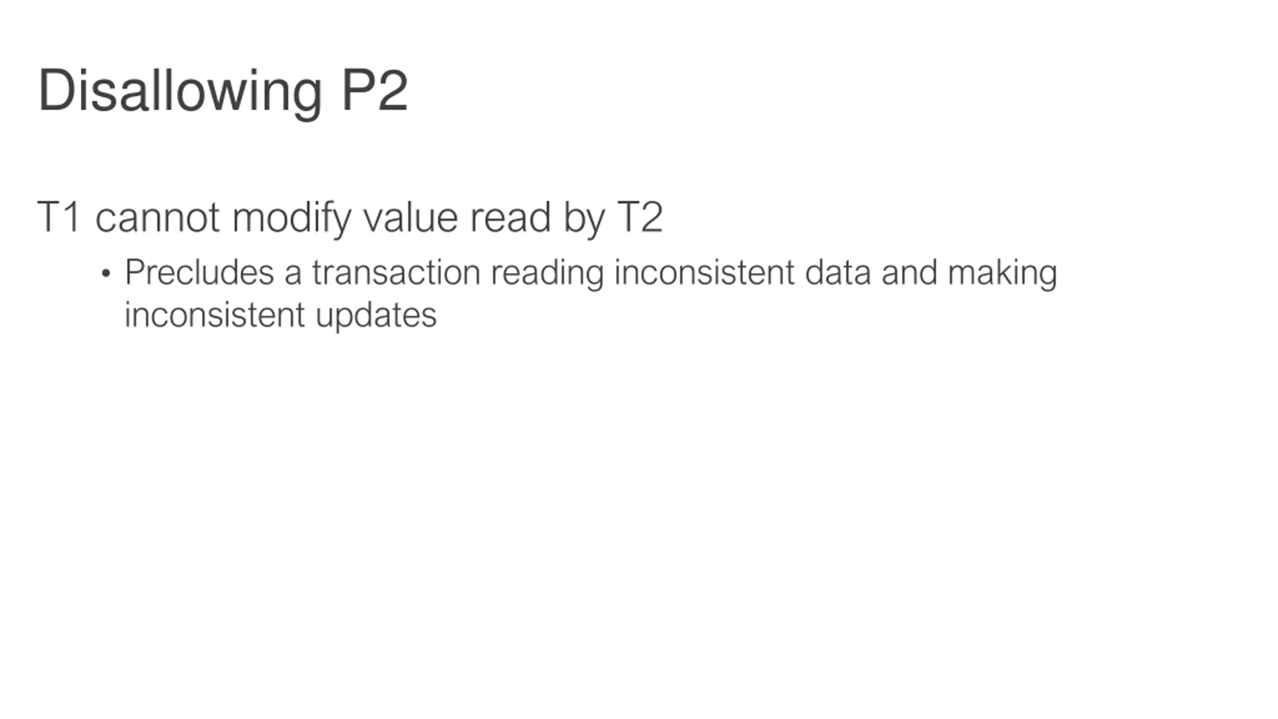 Disallowing P2 T1 cannot modify value read by T2 Precludes a transaction reading inconsistent data and making inconsistent updates