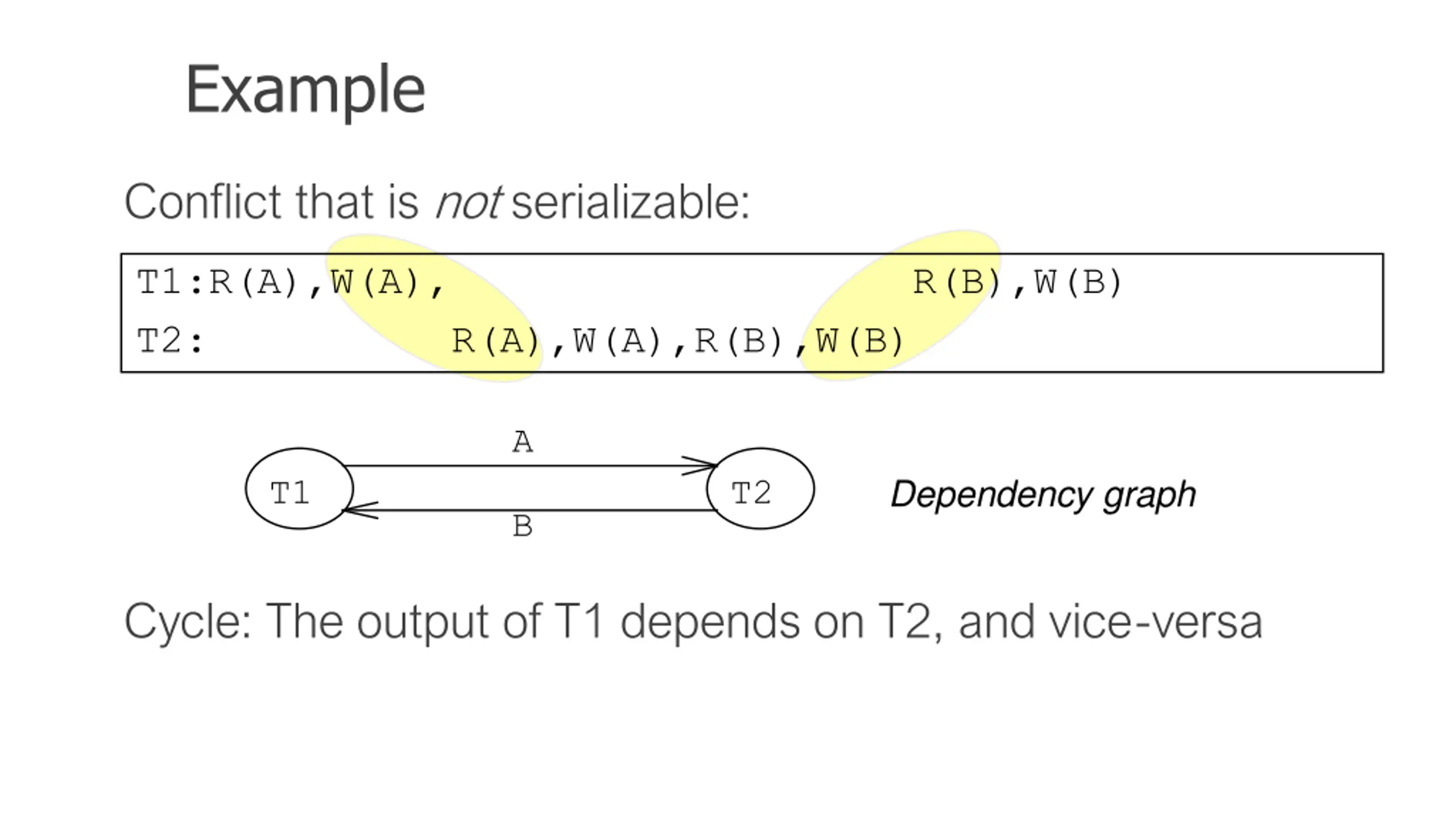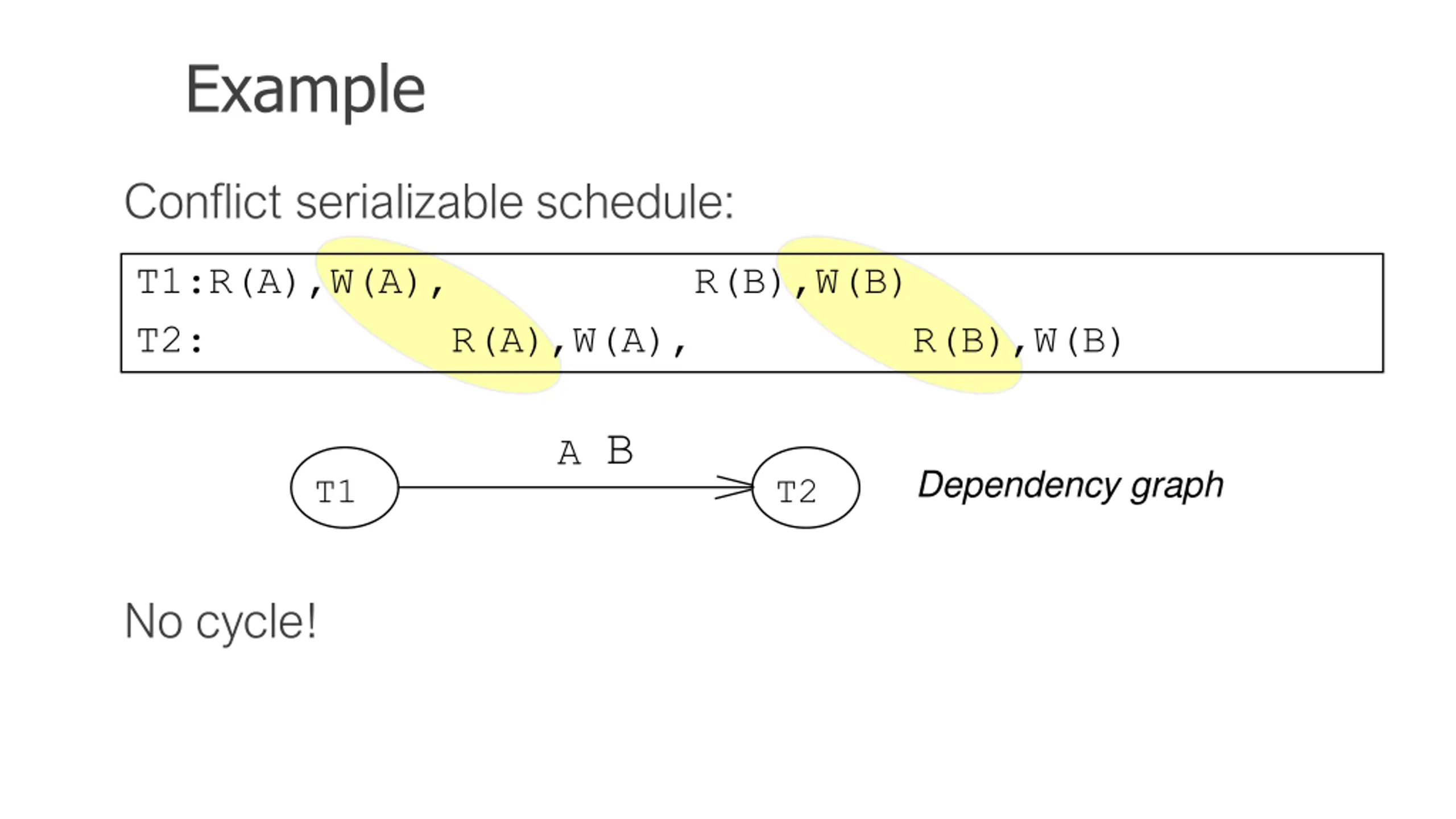 Example Conflict serializable schedule: T1:R(A),W(A), R(B),W(B) T2: R(A),W(A), R(B),W(B) B A Dependency graph T1 T2 No cycle!