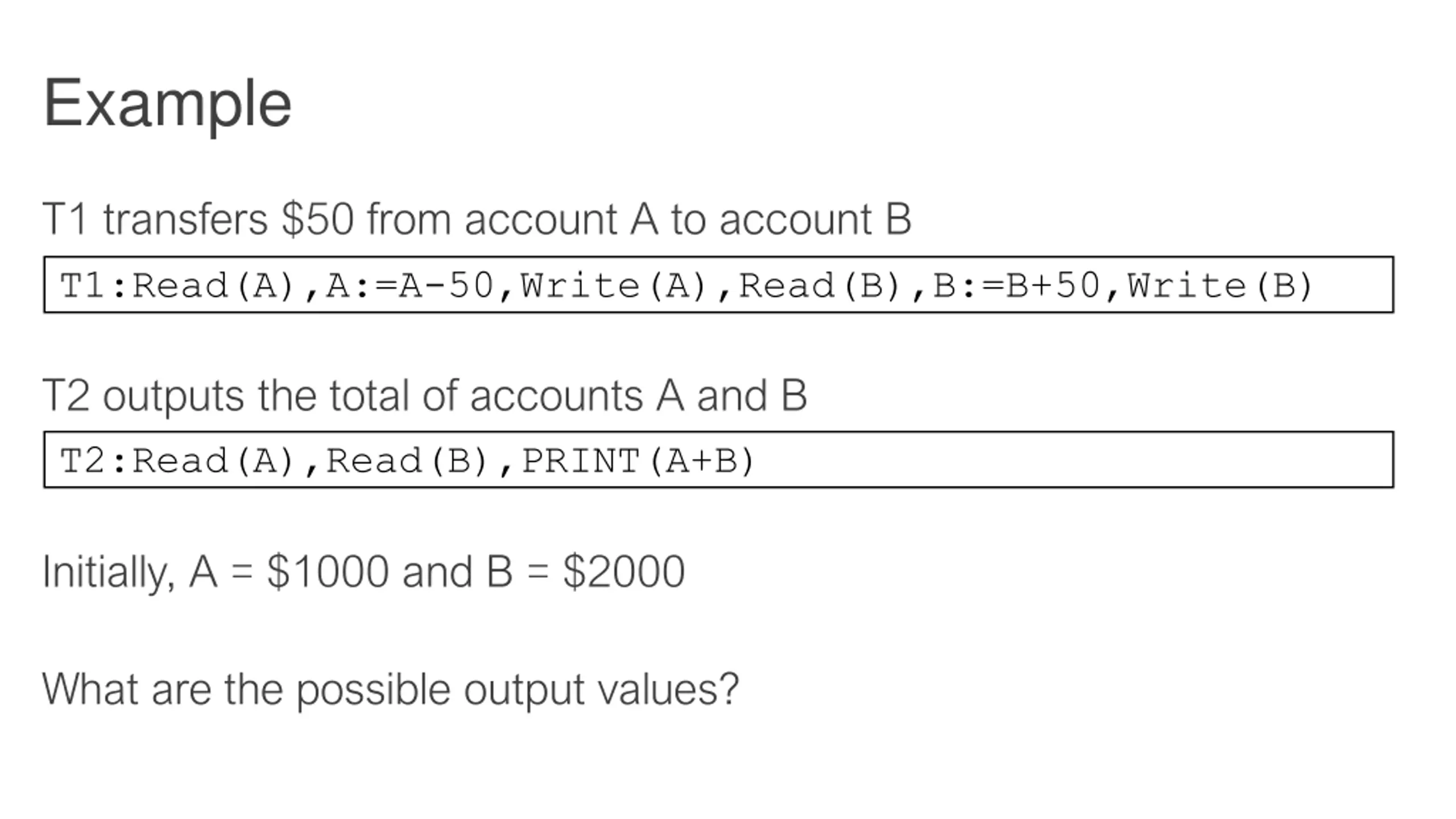 Example T1 transfers $50 from account A to account B T1:Read(A),A:=A-50,Write(A),Read(B),B:=B+50,Write(B) T2 outputs the total of accounts A and B T2:Read(A),Read(B),PRINT(A+B) Initially, A = $1000 and B = $2000 What are the possible output values?