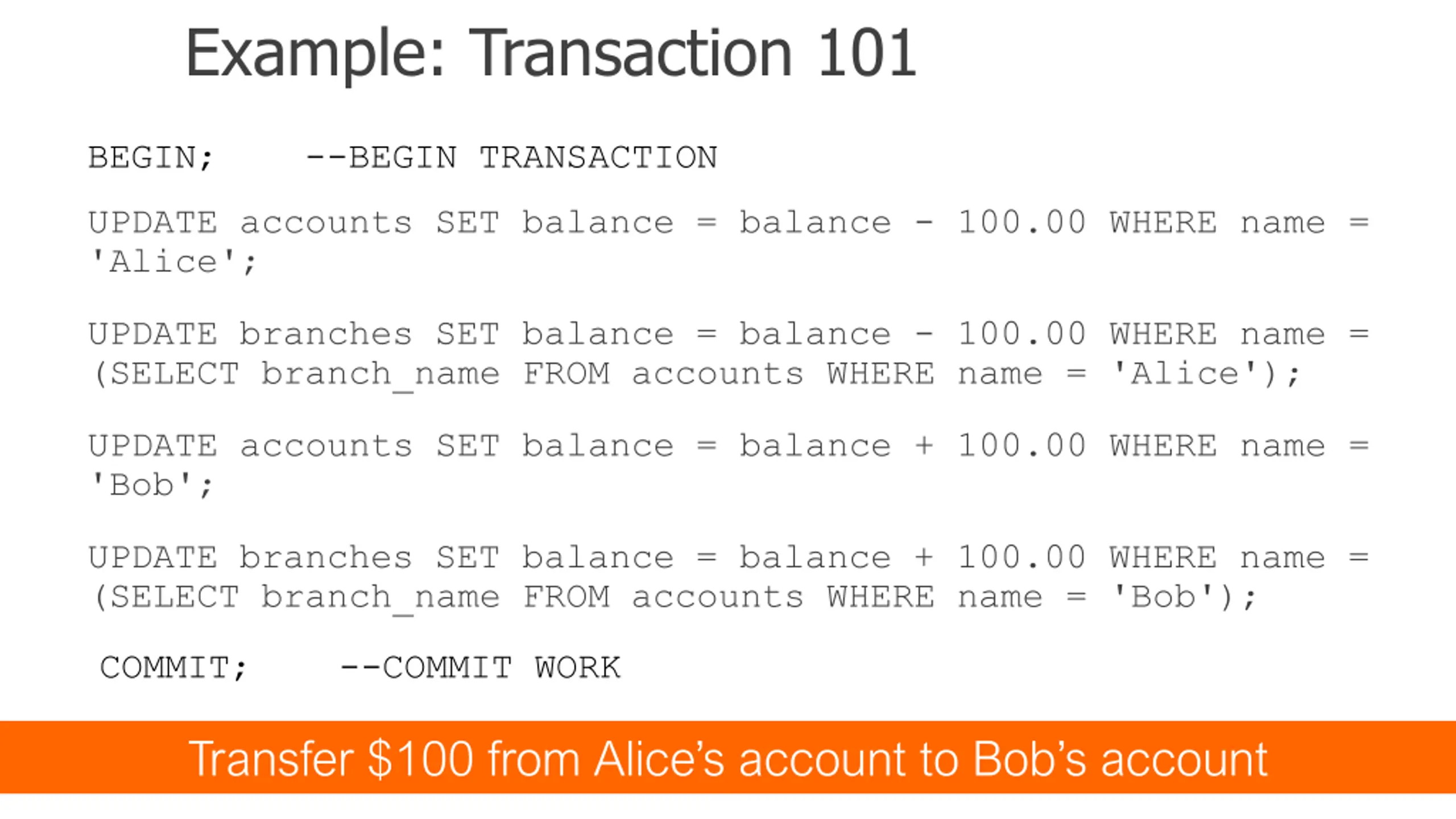 Example: Transaction 101 BEGIN; --BEGIN TRANSACTION UPDATE accounts SET balance = balance - 100.00 WHERE name = 'Alice'; UPDATE branches SET balance = balance - 100.00 WHERE name = (SELECT branch_name FROM accounts WHERE name = 'Alice'); UPDATE accounts SET balance = balance + 100.00 WHERE name = 'Bob'; UPDATE branches SET balance = balance + 100.00 WHERE name = (SELECT branch_name FROM accounts WHERE name = 'Bob'); COMMIT; --COMMIT WORK Transfer $100 from Alice s account to Bob s account