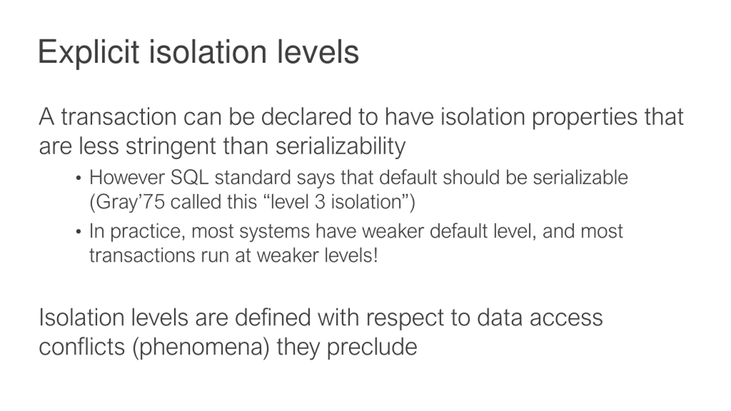 Explicit isolation levels A transaction can be declared to have isolation properties that are less stringent than serializability However SQL standard says that default should be serializable (Gray 75 called this level 3 isolation ) In practice, most systems have weaker default level, and most transactions run at weaker levels! Isolation levels are defined with respect to data access conflicts (phenomena) they preclude
