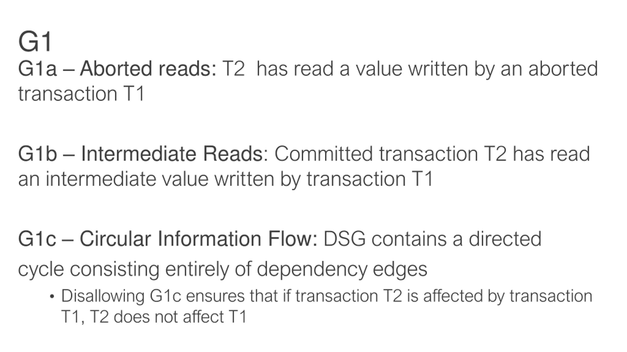 G1 G1a Aborted reads: T2 has read a value written by an aborted transaction T1 G1b Intermediate Reads: Committed transaction T2 has read an intermediate value written by transaction T1 G1c Circular Information Flow: DSG contains a directed cycle consisting entirely of dependency edges Disallowing G1c ensures that if transaction T2 is affected by transaction T1, T2 does not affect T1