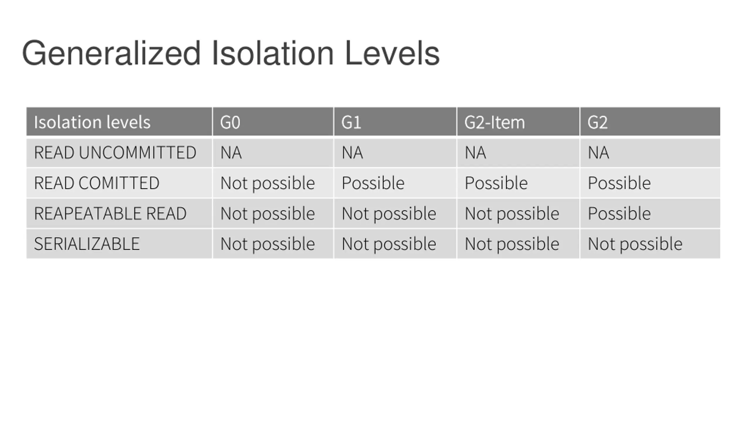 Generalized Isolation Levels Isolation levels READ UNCOMMITTED READ COMITTED REAPEATABLE READ SERIALIZABLE G0 G0 NA Not possible Not possible Not possible G1 G1 NA Possible Not possible Not possible G2 G2- -Item Item NA Possible Not possible Not possible G2 G2 NA Possible Possible Not possible