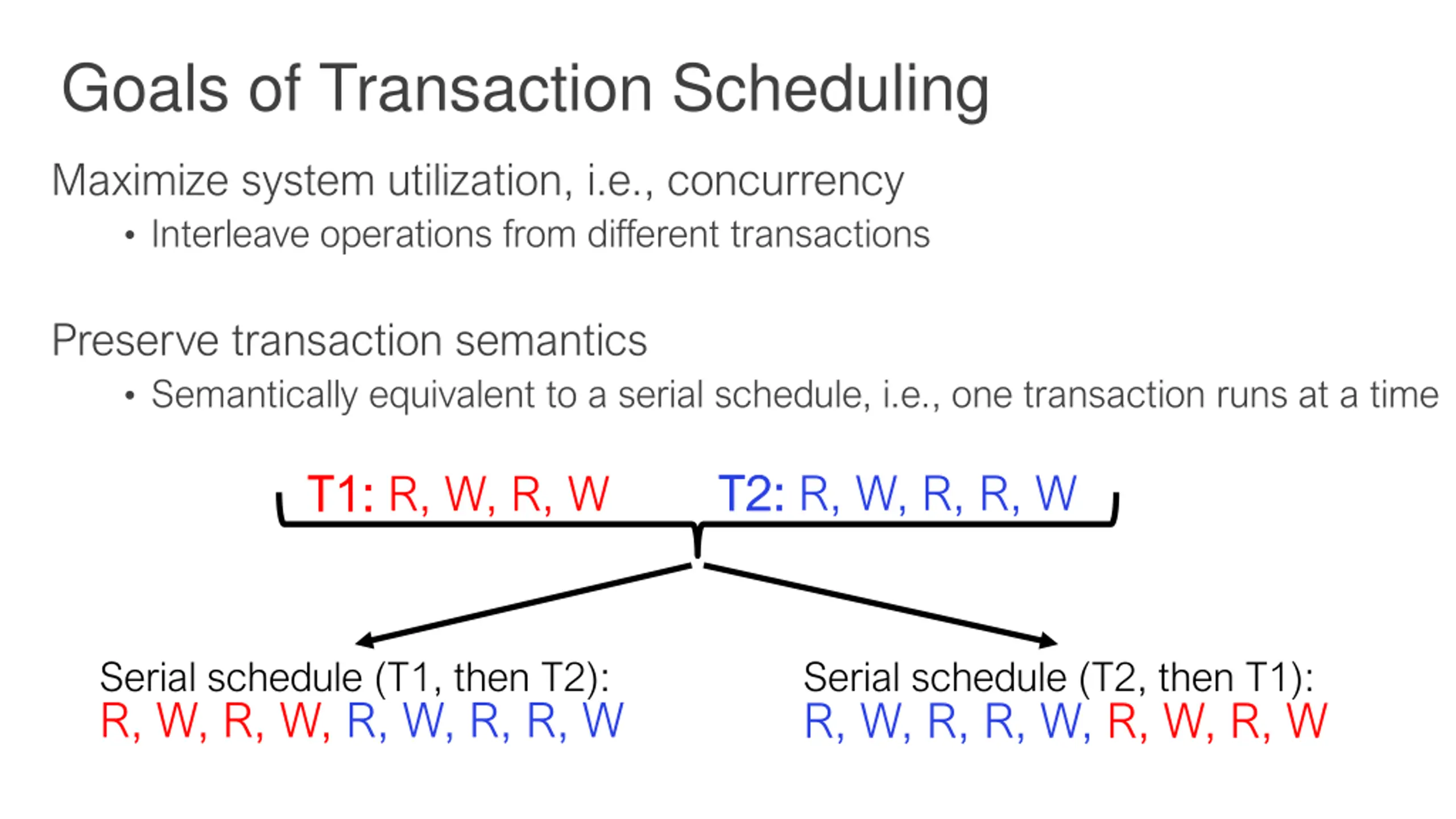 Goals of Transaction Scheduling Maximize system utilization, i.e., concurrency Interleave operations from different transactions Preserve transaction semantics Semantically equivalent to a serial schedule, i.e., one transaction runs at a time T2: T2: R, W, R, R, W T1: T1: R, W, R, W Serial schedule (T1, then T2): Serial schedule (T2, then T1): R, W, R, W, R, W, R, R, W R, W, R, R, W, R, W, R, W