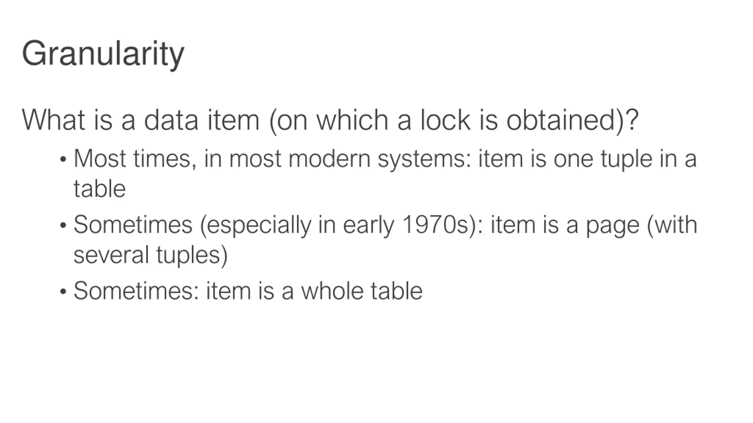 Granularity What is a data item (on which a lock is obtained)? Most times, in most modern systems: item is one tuple in a table Sometimes (especially in early 1970s): item is a page (with several tuples) Sometimes: item is a whole table