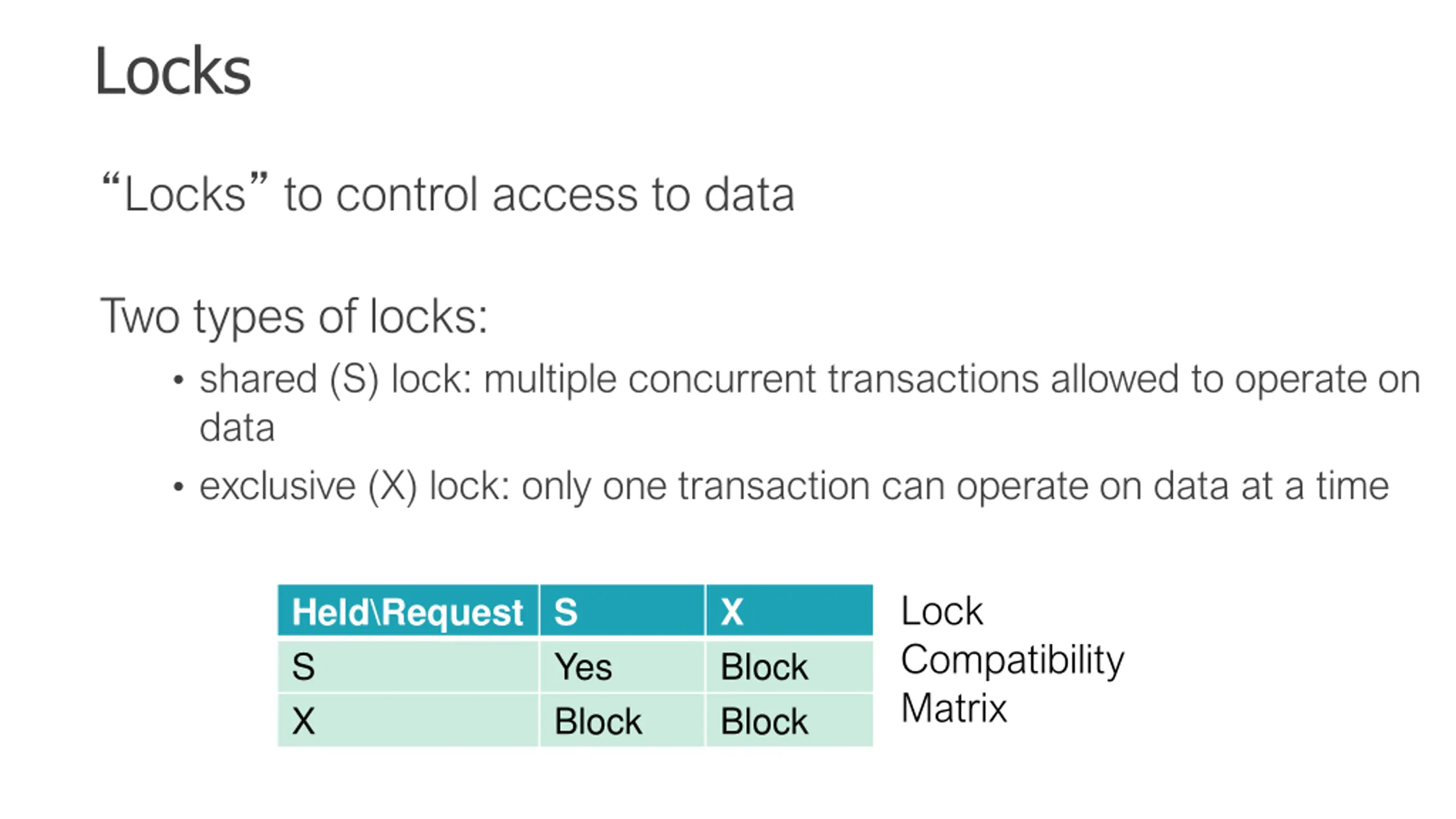 Locks Locks to control access to data Two types of locks: shared (S) lock: multiple concurrent transactions allowed to operate on data exclusive (X) lock: only one transaction can operate on data at a time Lock Compatibility Matrix Held\Request S S X X Block Block Yes Block