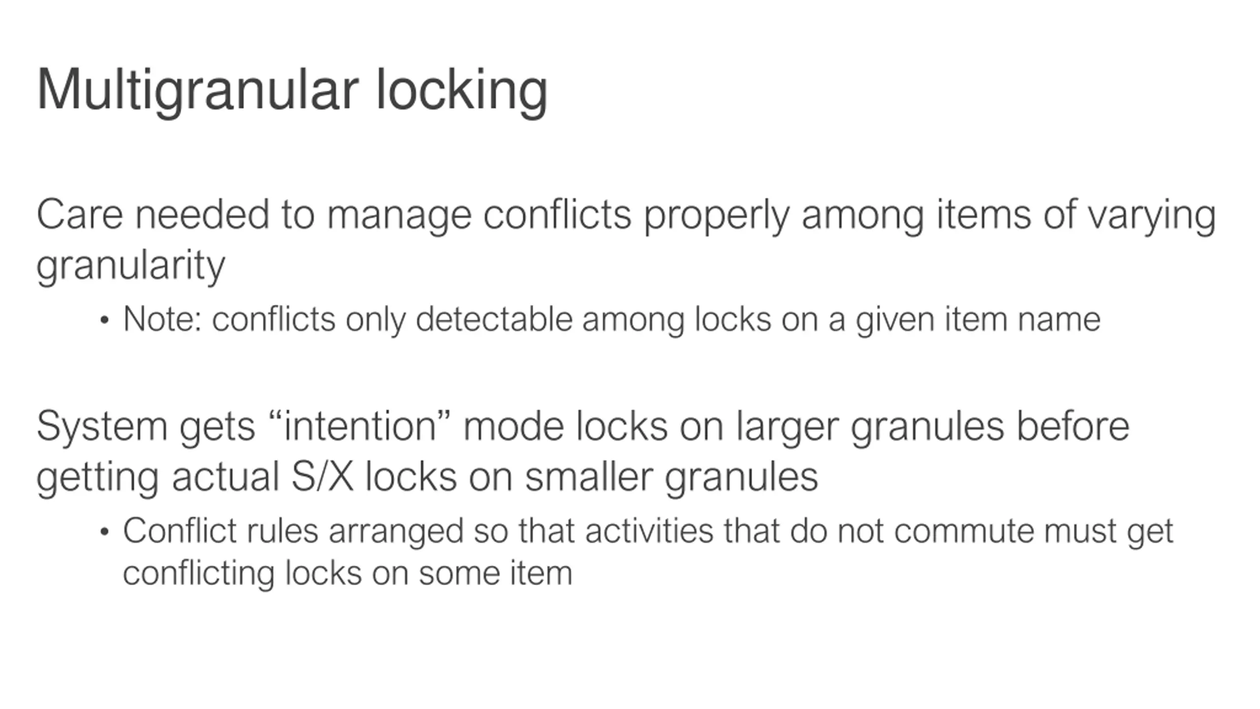 Multigranular locking Care needed to manage conflicts properly among items of varying granularity Note: conflicts only detectable among locks on a given item name System gets intention mode locks on larger granules before getting actual S/X locks on smaller granules Conflict rules arranged so that activities that do not commute must get conflicting locks on some item
