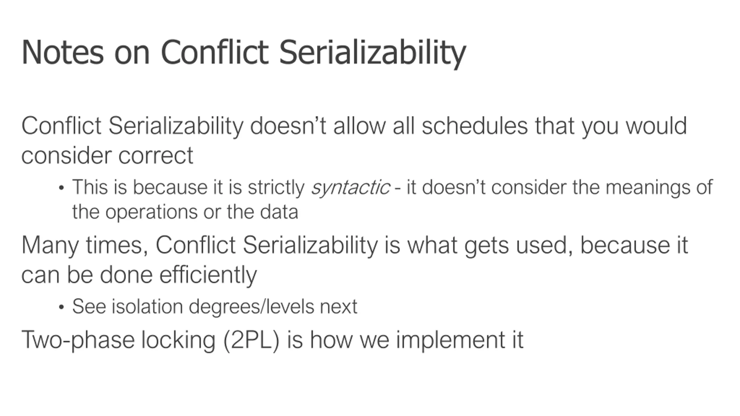 Notes on Conflict Serializability Conflict Serializability doesn t allow all schedules that you would consider correct This is because it is strictly syntactic - it doesn t consider the meanings of the operations or the data Many times, Conflict Serializability is what gets used, because it can be done efficiently See isolation degrees/levels next Two-phase locking (2PL) is how we implement it