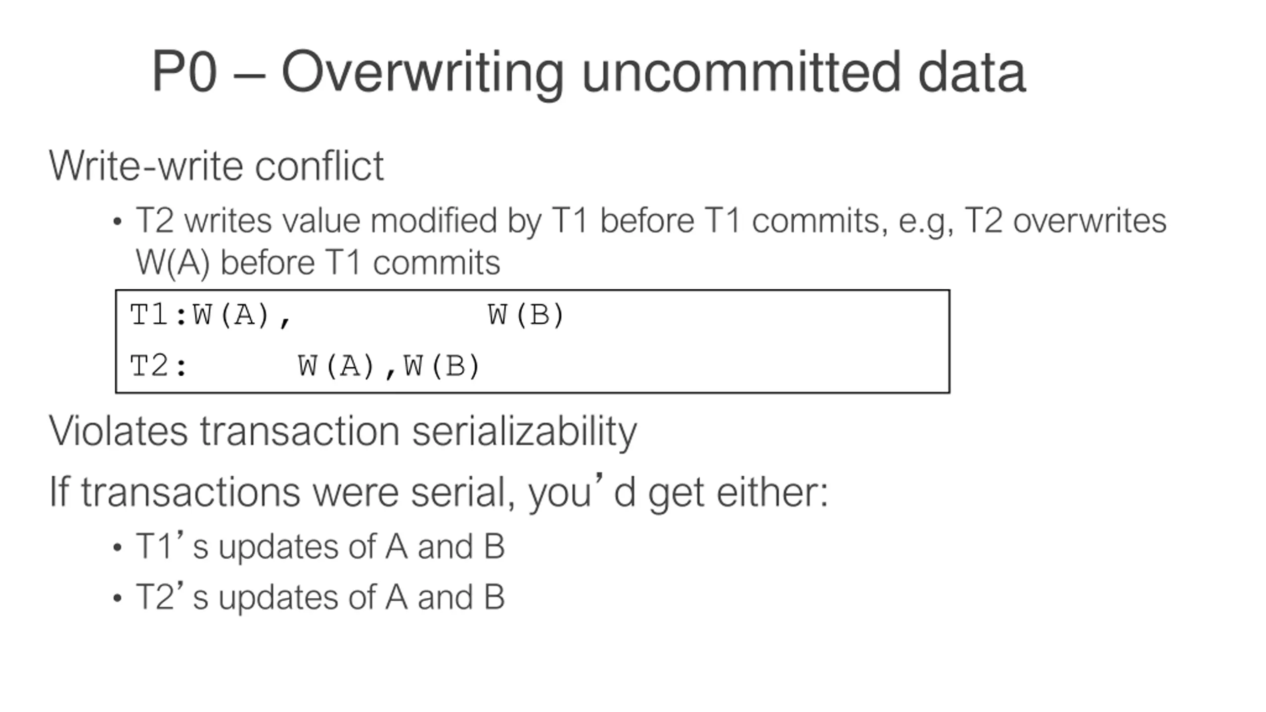 P0 Overwriting uncommitted data Write-write conflict T2 writes value modified by T1 before T1 commits, e.g, T2 overwrites W(A) before T1 commits T1:W(A), W(B) T2: W(A),W(B) Violates transaction serializability If transactions were serial, you d get either: T1 s updates of A and B T2 s updates of A and B