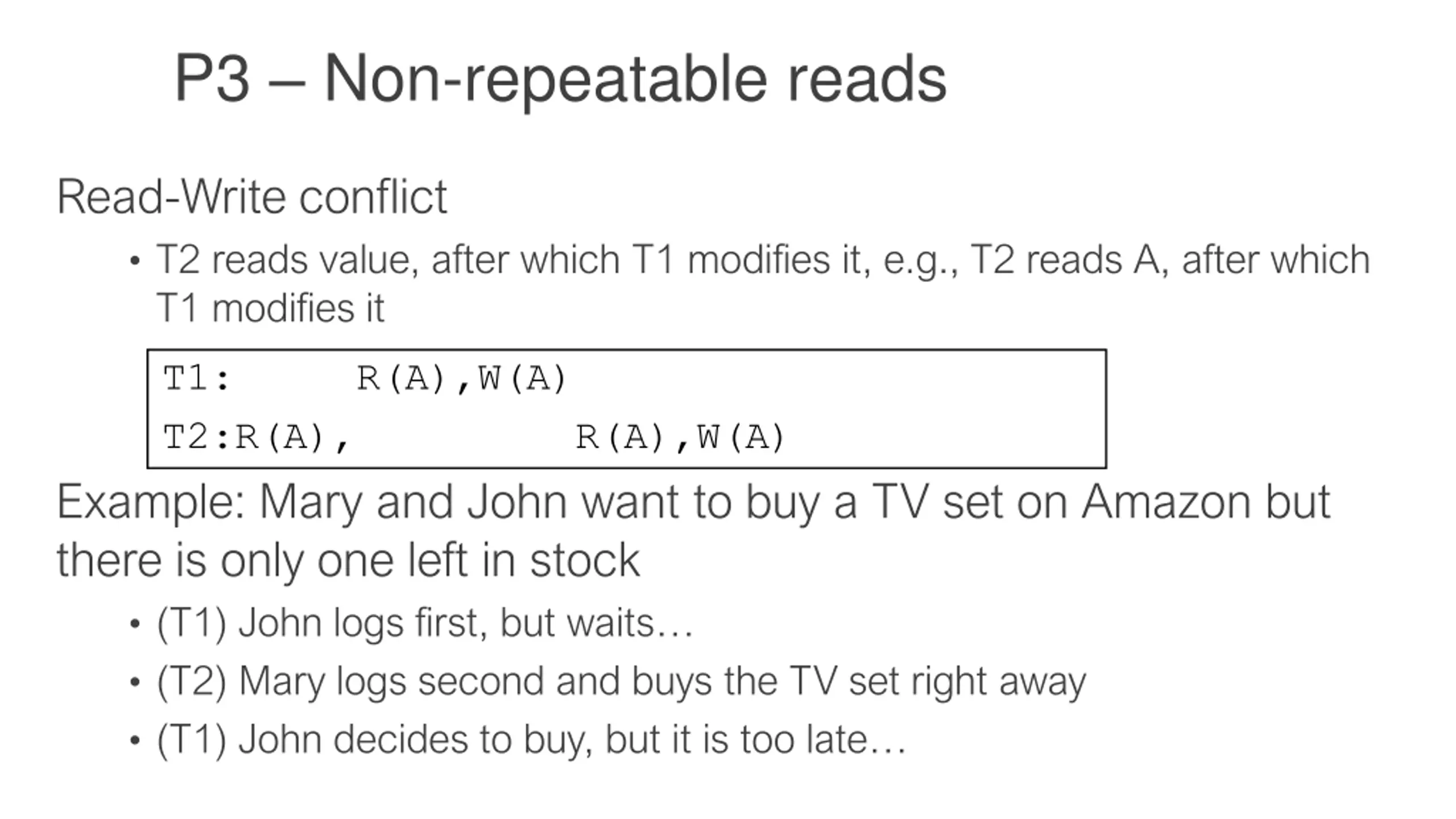 P3 Non-repeatable reads Read-Write conflict T2 reads value, after which T1 modifies it, e.g., T2 reads A, after which T1 modifies it T1: R(A),W(A) T2:R(A), R(A),W(A) Example: Mary and John want to buy a TV set on Amazon but there is only one left in stock (T1) John logs first, but waits (T2) Mary logs second and buys the TV set right away (T1) John decides to buy, but it is too late