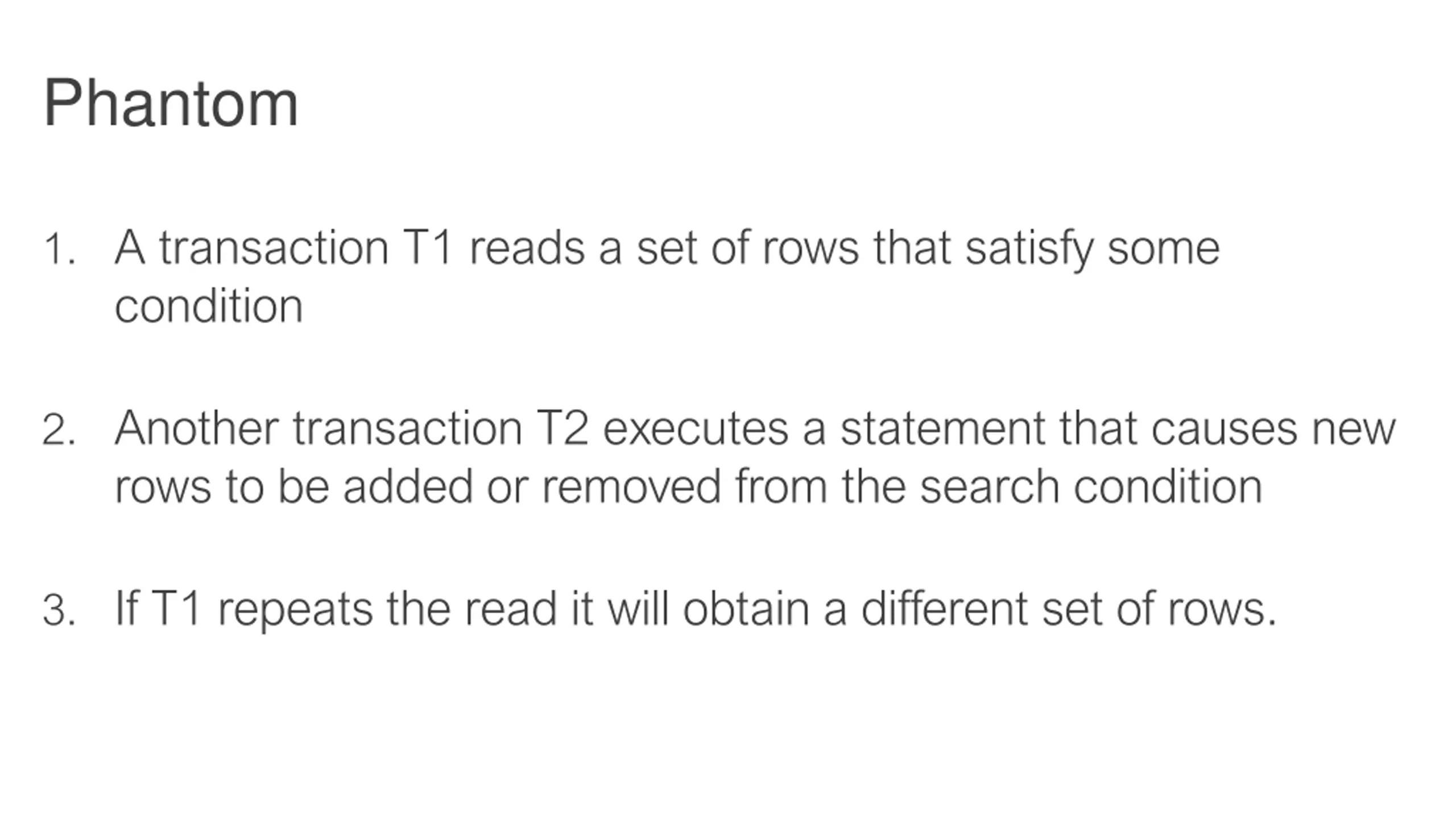 Phantom 1. A transaction T1 reads a set of rows that satisfy some condition 2. Another transaction T2 executes a statement that causes new rows to be added or removed from the search condition 3. If T1 repeats the read it will obtain a different set of rows.
