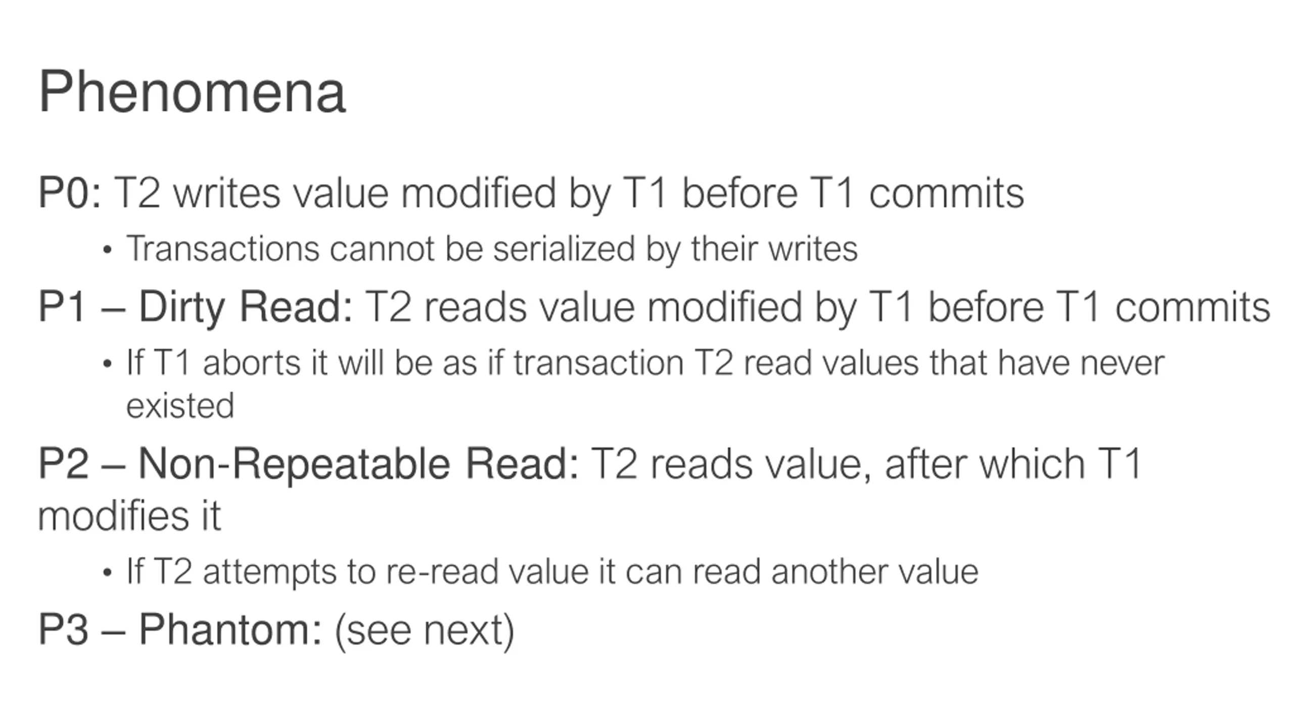 Phenomena P0: T2 writes value modified by T1 before T1 commits Transactions cannot be serialized by their writes P1 Dirty Read: T2 reads value modified by T1 before T1 commits If T1 aborts it will be as if transaction T2 read values that have never existed P2 Non-Repeatable Read: T2 reads value, after which T1 modifies it If T2 attempts to re-read value it can read another value P3 Phantom: (see next)