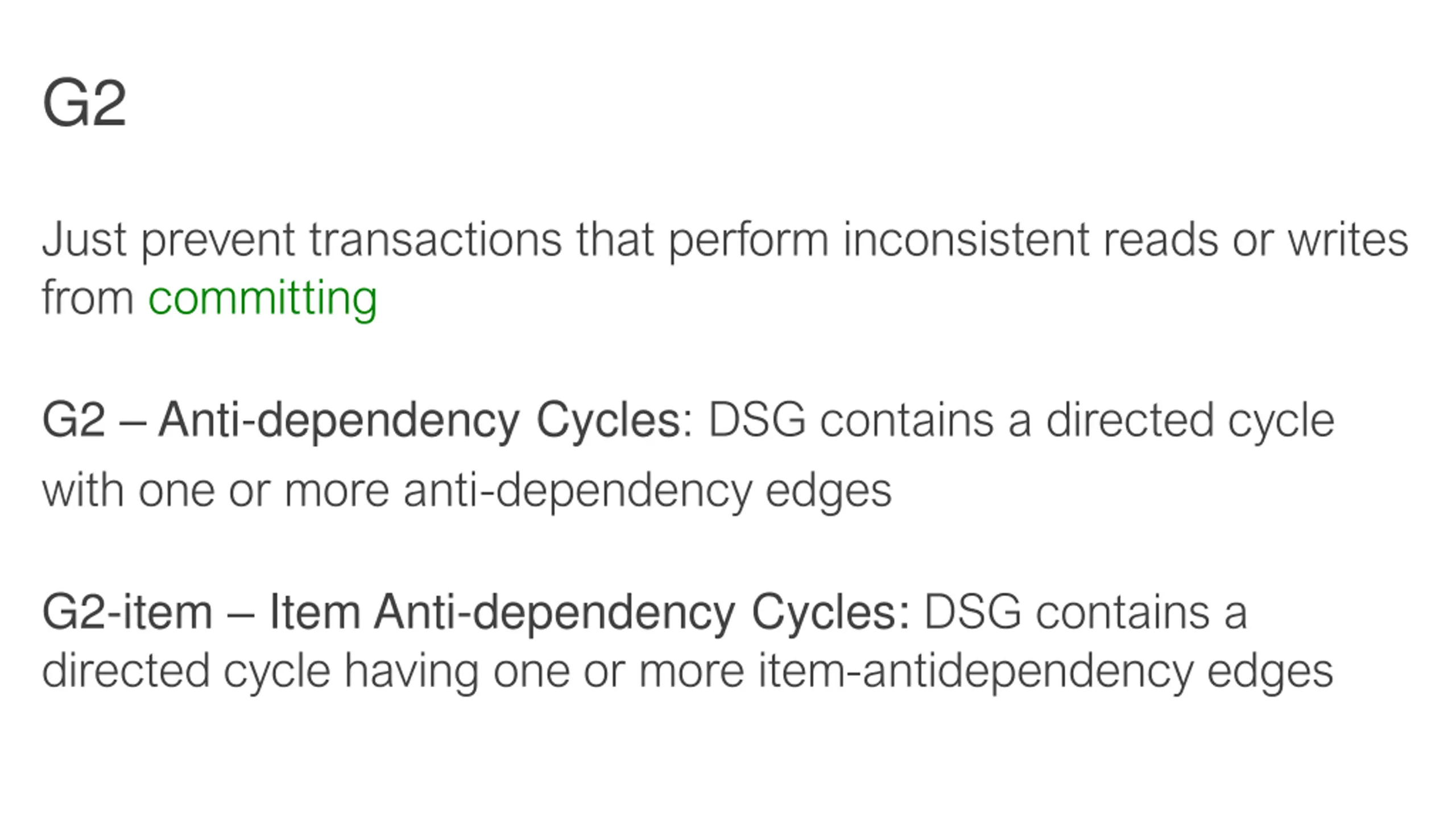 G2 Just prevent transactions that perform inconsistent reads or writes from committing G2 Anti-dependency Cycles: DSG contains a directed cycle with one or more anti-dependency edges G2-item Item Anti-dependency Cycles: DSG contains a directed cycle having one or more item-antidependency edges