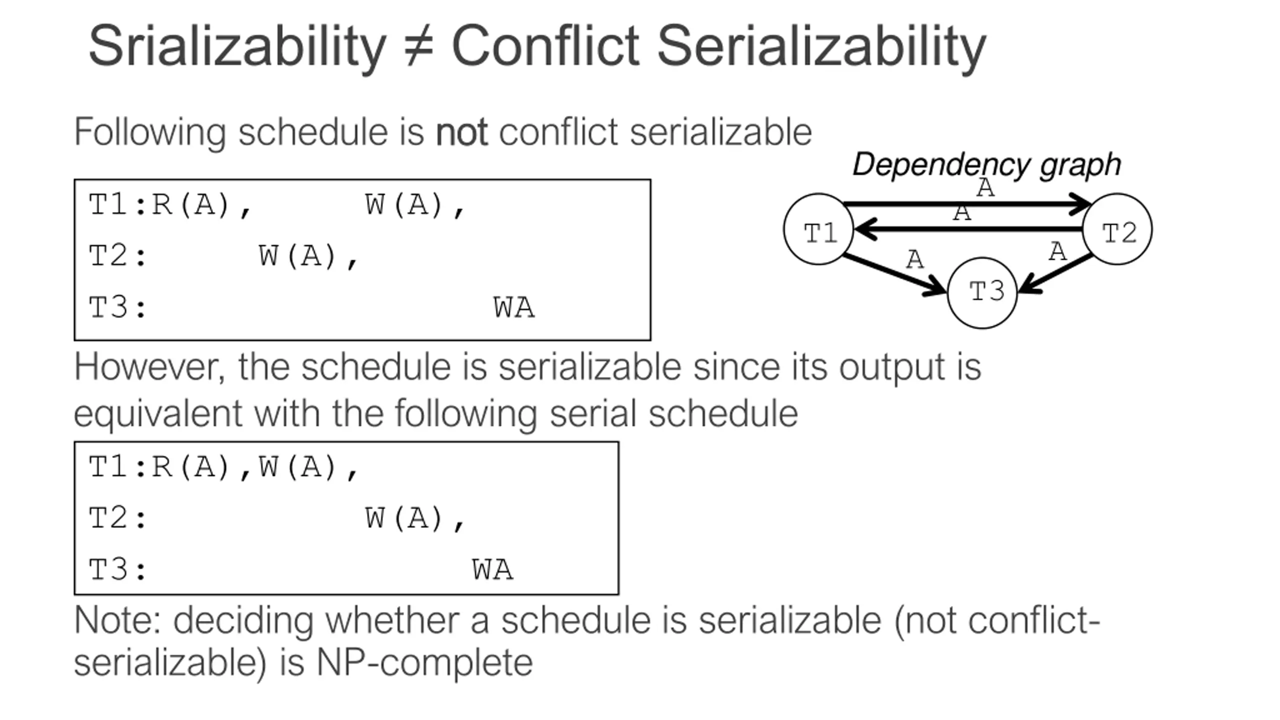 Srializability Conflict Serializability Following schedule is not not conflict serializable Dependency graph A A A T1:R(A), W(A), T2: W(A), T3: WA However, the schedule is serializable since its output is equivalent with the following serial schedule T1:R(A),W(A), T2: W(A), T3: WA T1 T2 A T3 Note: deciding whether a schedule is serializable (not conflict- serializable) is NP-complete