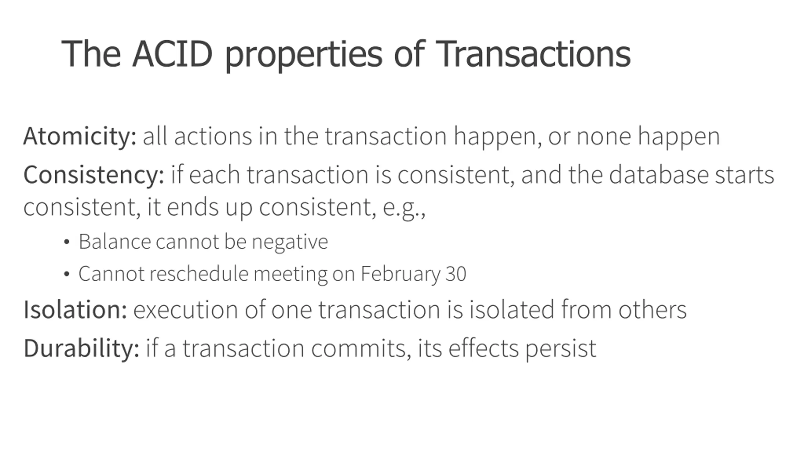 The ACID properties of Transactions Atomicity:all actions in the transaction happen, or none happen Consistency:if each transaction is consistent, and the database starts consistent, it ends up consistent, e.g., Balance cannot be negative Cannot reschedule meeting on February 30 Isolation:execution of one transaction is isolated from others Durability:if a transaction commits, its effects persist