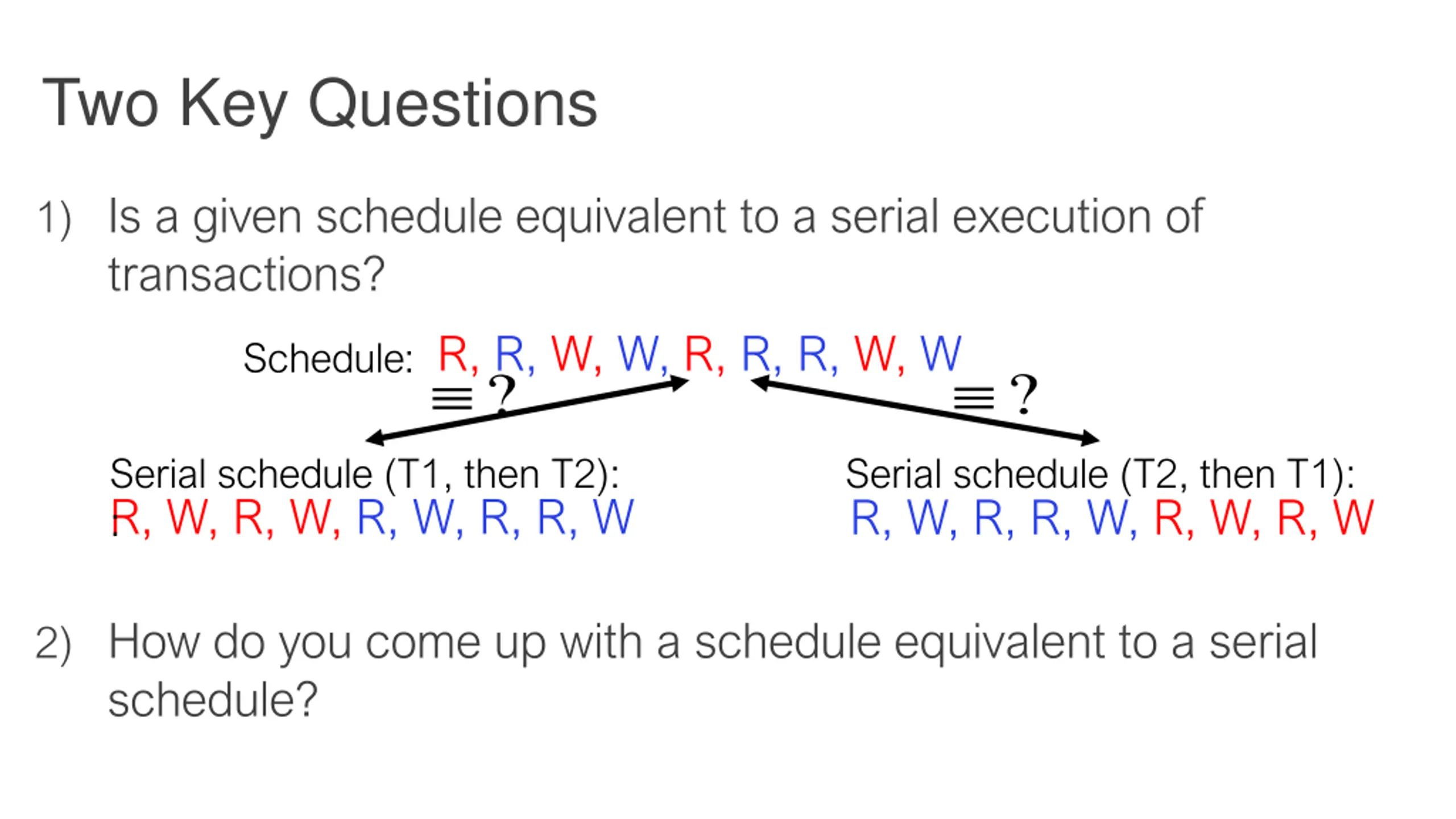 Two Key Questions 1) Is a given schedule equivalent to a serial execution of transactions? R, R, W, W, R, R, R, W, W Schedule: ? ? Serial schedule (T1, then T2): Serial schedule (T2, then T1): R, W, R, W, R, W, R, R, W : R, W, R, R, W, R, W, R, W 2) How do you come up with a schedule equivalent to a serial schedule?