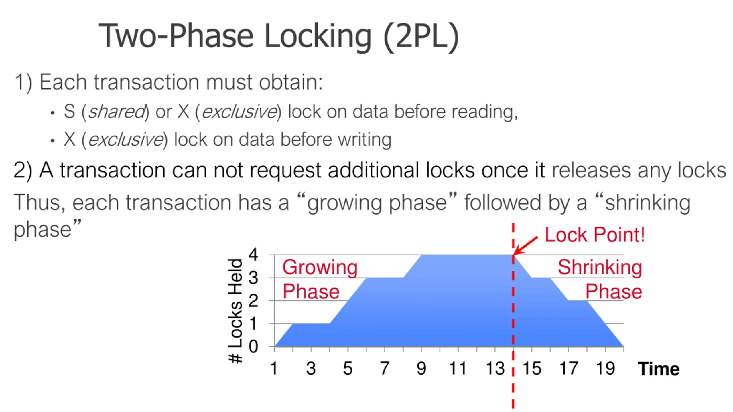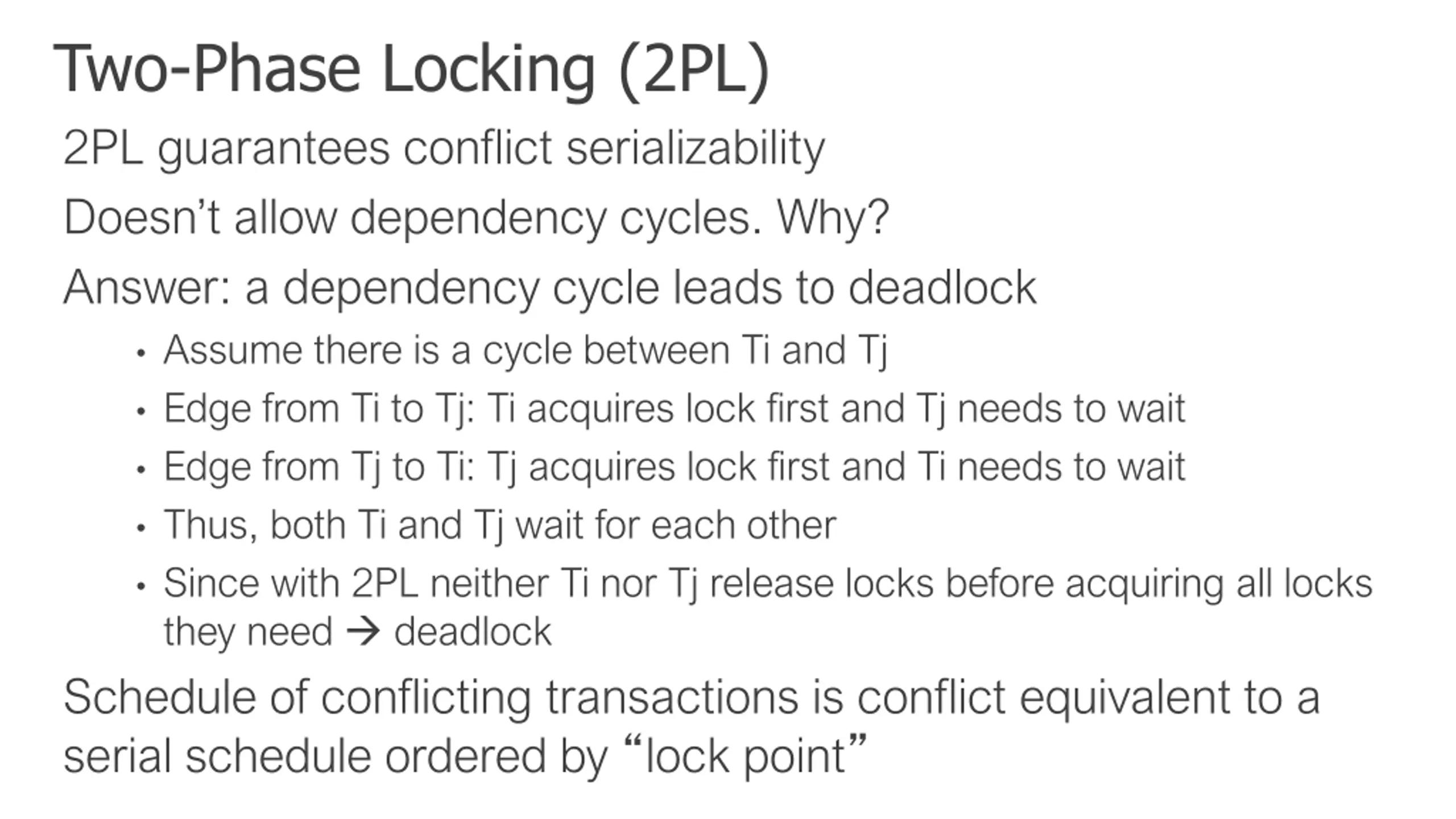 Two-Phase Locking (2PL) 2PL guarantees conflict serializability Doesn t allow dependency cycles. Why? Answer: a dependency cycle leads to deadlock Assume there is a cycle between Ti and Tj Edge from Ti to Tj: Ti acquires lock first and Tj needs to wait Edge from Tj to Ti: Tj acquires lock first and Ti needs to wait Thus, both Ti and Tj wait for each other Since with 2PL neither Ti nor Tj release locks before acquiring all locks they need deadlock Schedule of conflicting transactions is conflict equivalent to a serial schedule ordered by lock point