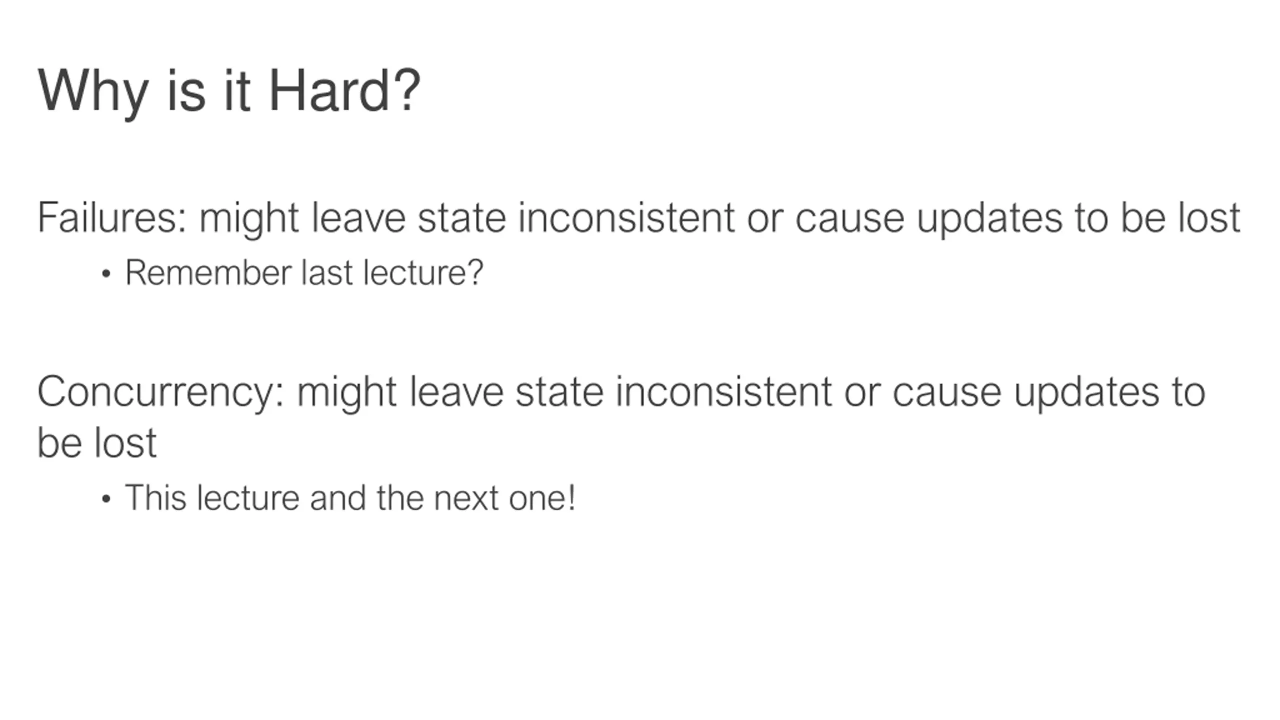 Why is it Hard? Failures: might leave state inconsistent or cause updates to be lost Remember last lecture? Concurrency: might leave state inconsistent or cause updates to be lost This lecture and the next one!