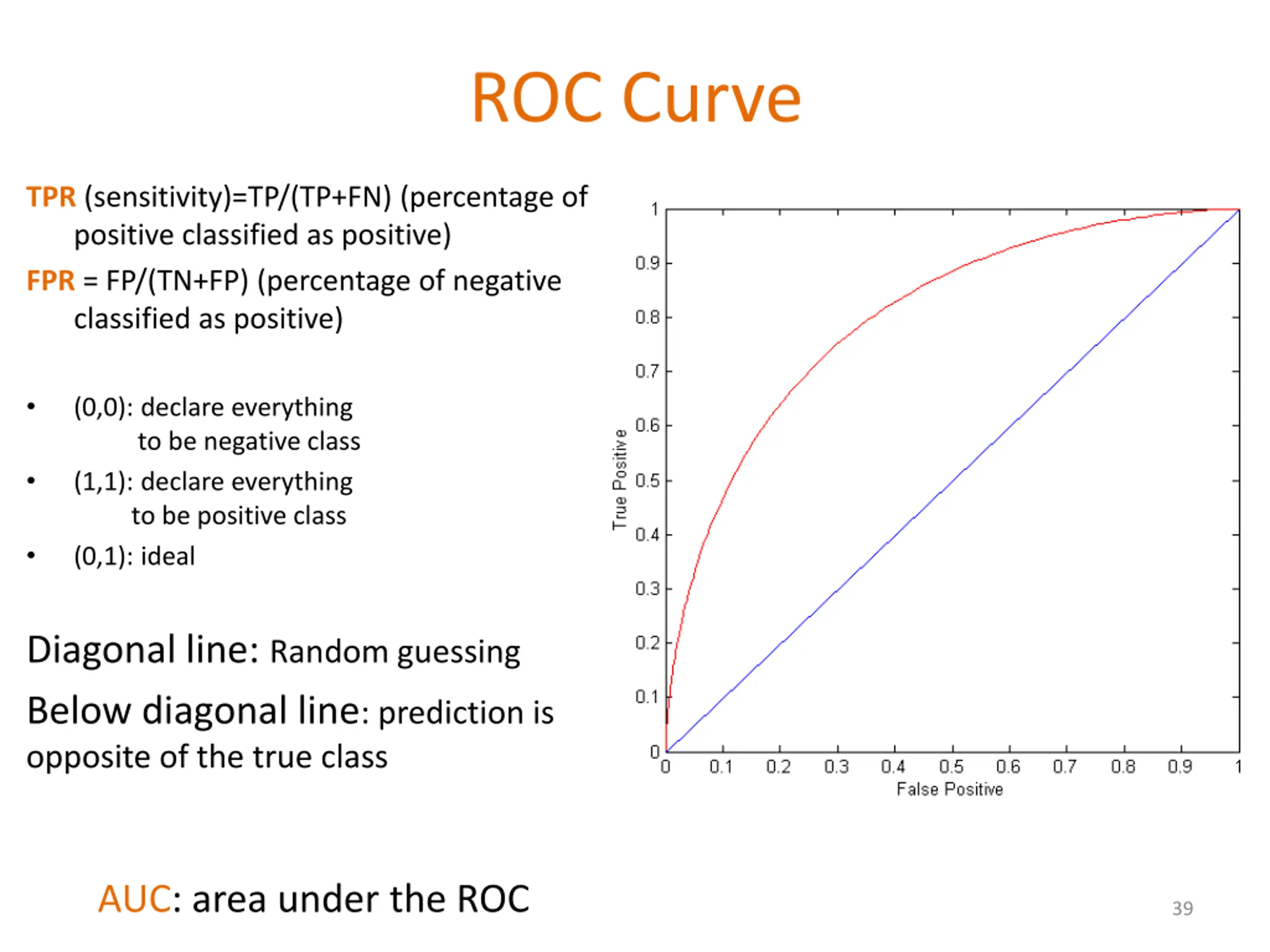 ROC Curve TPR (sensitivity)=TP/(TP+FN) (percentage of positive classified as positive) FPR = FP/(TN+FP) (percentage of negative classified as positive) (0,0): declare everything to be negative class (1,1): declare everything to be positive class (0,1): ideal Diagonal line: Random guessing Below diagonal line: prediction is opposite of the true class AUC: area under the ROC 39
