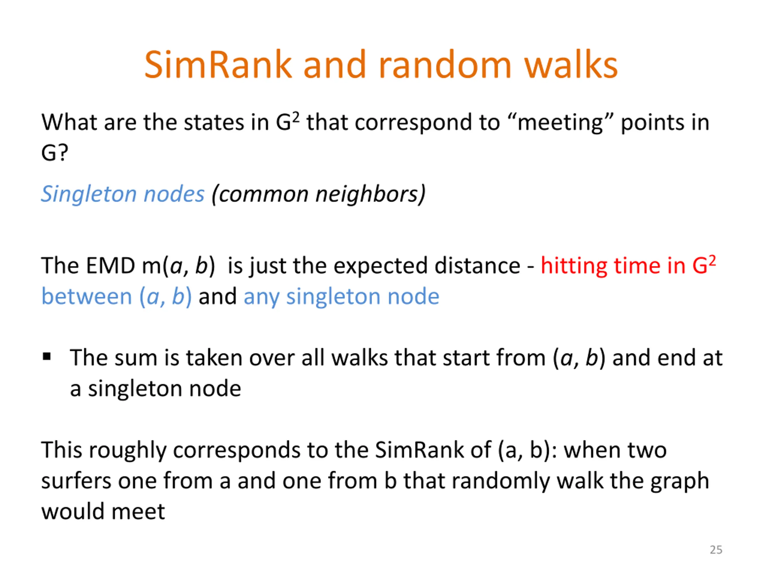 SimRank and random walks What are the states in G2that correspond to meeting points in G? Singleton nodes (common neighbors) The EMD m(a, b) is just the expected distance - hitting time in G2 between (a, b) and any singleton node The sum is taken over all walks that start from (a, b) and end at a singleton node This roughly corresponds to the SimRank of (a, b): when two surfers one from a and one from b that randomly walk the graph would meet 25
