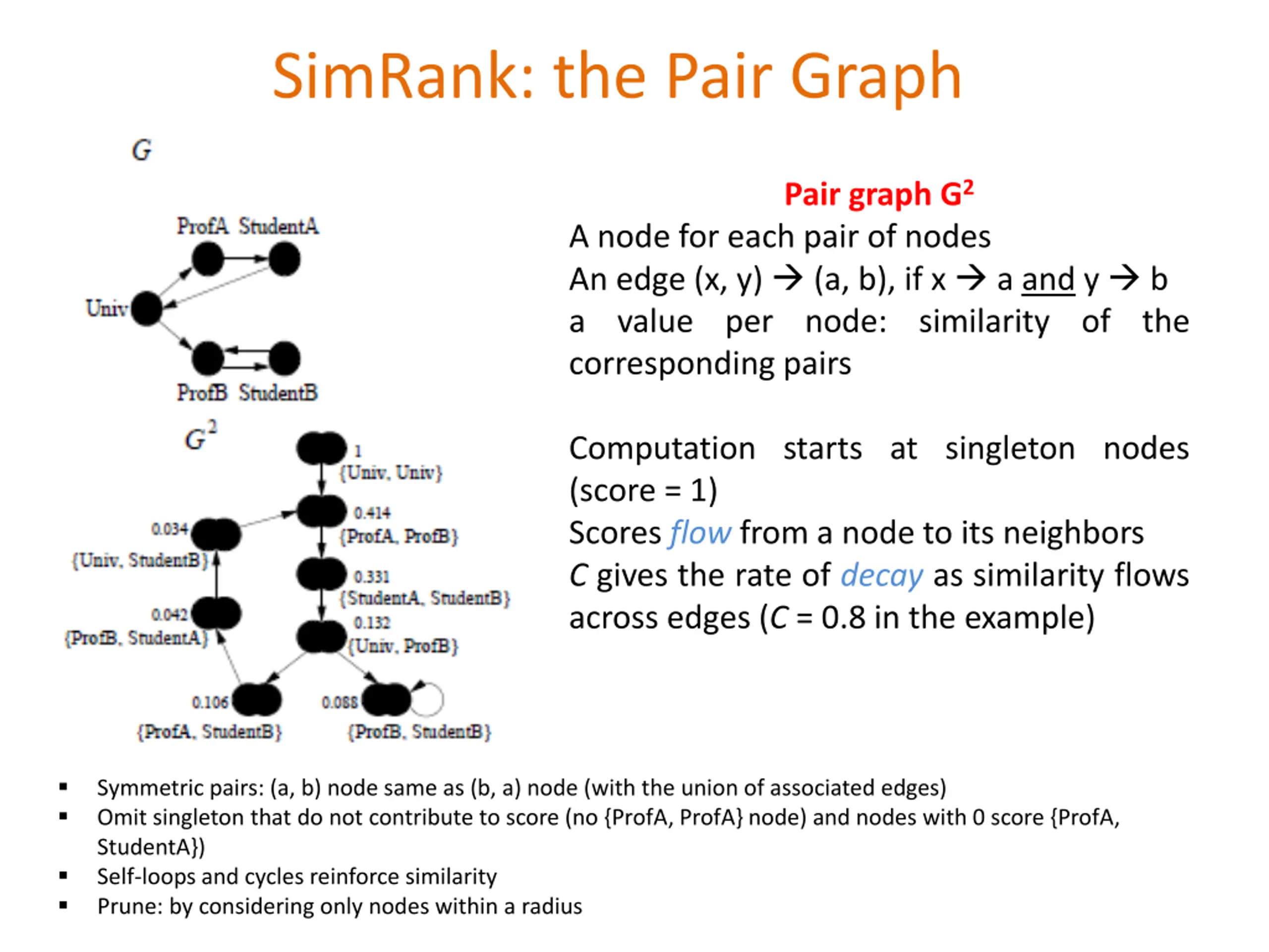 SimRank: the Pair Graph Pair graph G2 A node for each pair of nodes An edge (x, y) (a, b), if x a and y b a value per node: similarity of the corresponding pairs Computation starts at singleton nodes (score = 1) Scores flow from a node to its neighbors C gives the rate of decay as similarity flows across edges (C = 0.8 in the example) Symmetric pairs: (a, b) node same as (b, a) node (with the union of associated edges) Omit singleton that do not contribute to score (no {ProfA, ProfA} node) and nodes with 0 score {ProfA, StudentA}) Self-loops and cycles reinforce similarity Prune: by considering only nodes within a radius