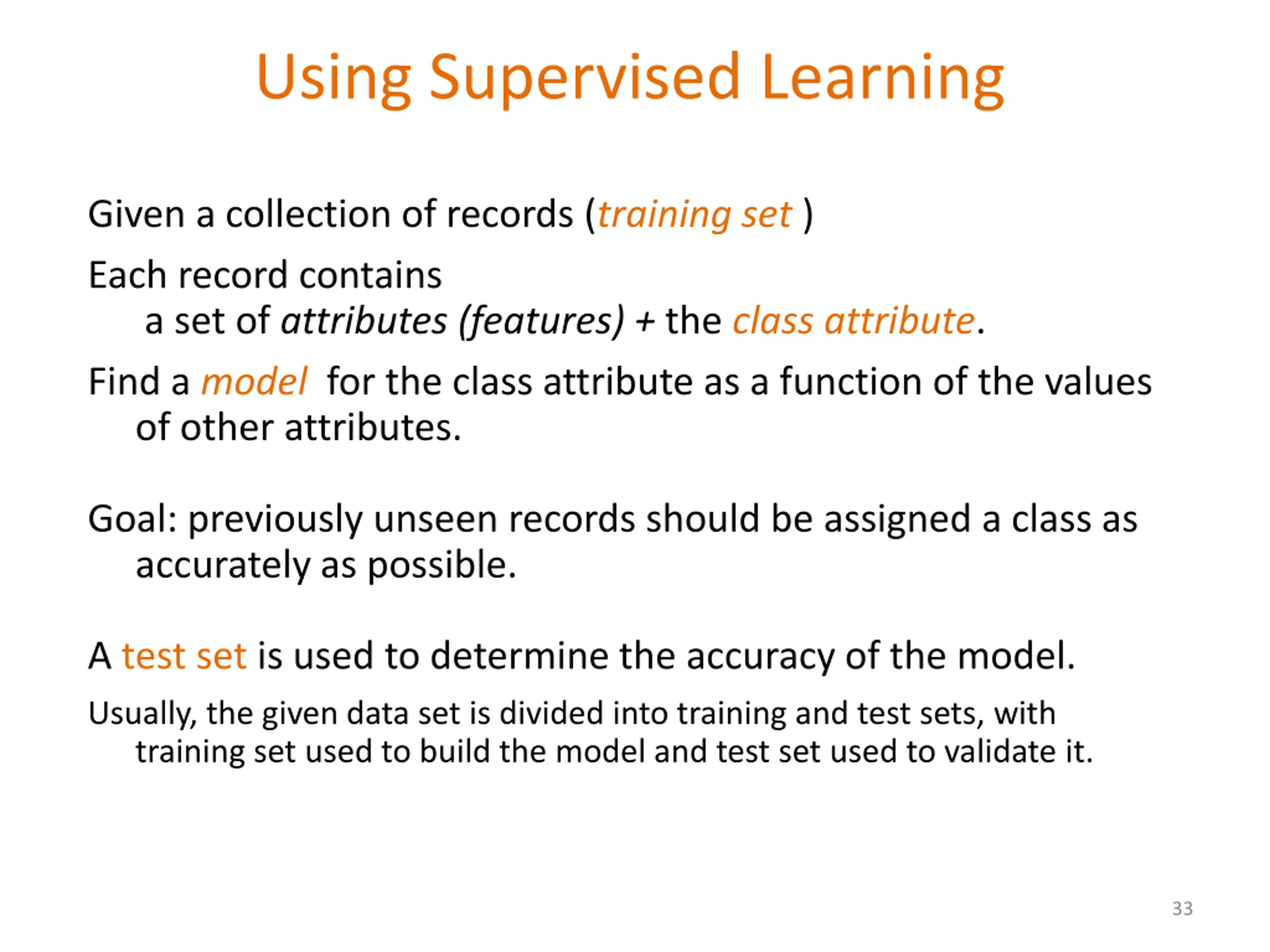 Using Supervised Learning Given a collection of records (training set ) Each record contains a set of attributes (features) + the class attribute. Find a model for the class attribute as a function of the values of other attributes. Goal: previously unseen records should be assigned a class as accurately as possible. A test set is used to determine the accuracy of the model. Usually, the given data set is divided into training and test sets, with training set used to build the model and test set used to validate it. 33