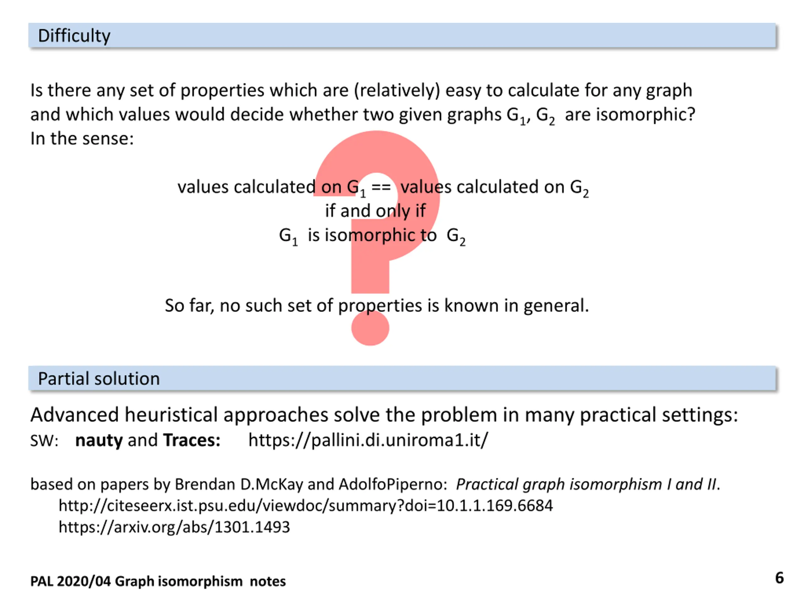 Difficulty Is there any set of properties which are (relatively) easy to calculate for any graph and which values would decide whether two given graphs G1, G2are isomorphic? In the sense: values calculated on G1== values calculated on G2 if and only if G1is isomorphic to G2 So far, no such set of properties is known in general. Partial solution Advanced heuristical approaches solve the problem in many practical settings: SW: nauty and Traces: https://pallini.di.uniroma1.it/ based on papers by Brendan D.McKay and AdolfoPiperno: Practical graph isomorphism I and II. http://citeseerx.ist.psu.edu/viewdoc/summary?doi=10.1.1.169.6684 https://arxiv.org/abs/1301.1493 6 PAL 2020/04 Graph isomorphism notes