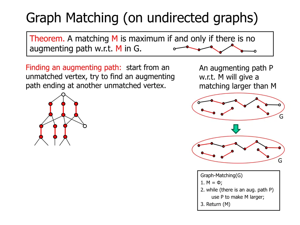Graph Matching (on undirected graphs) Theorem. A matching M is maximum if and only if there is no augmenting path w.r.t. M in G. An augmenting path P w.r.t. M will give a matching larger than M G G